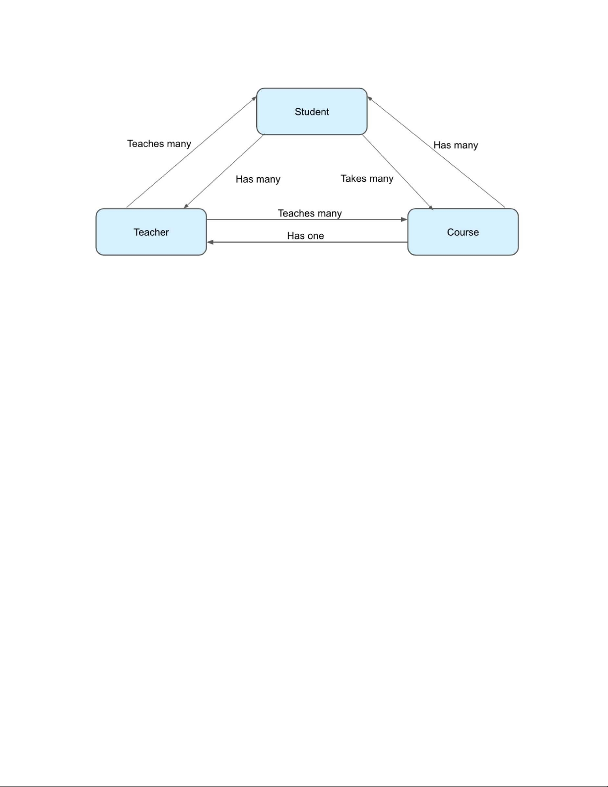 "teachers," and "course." A course would have one teacher, but a student might have many