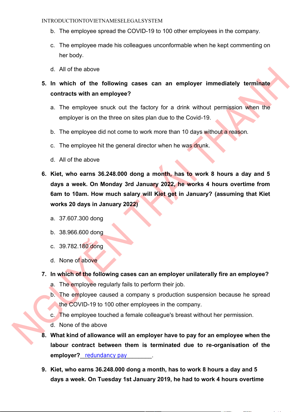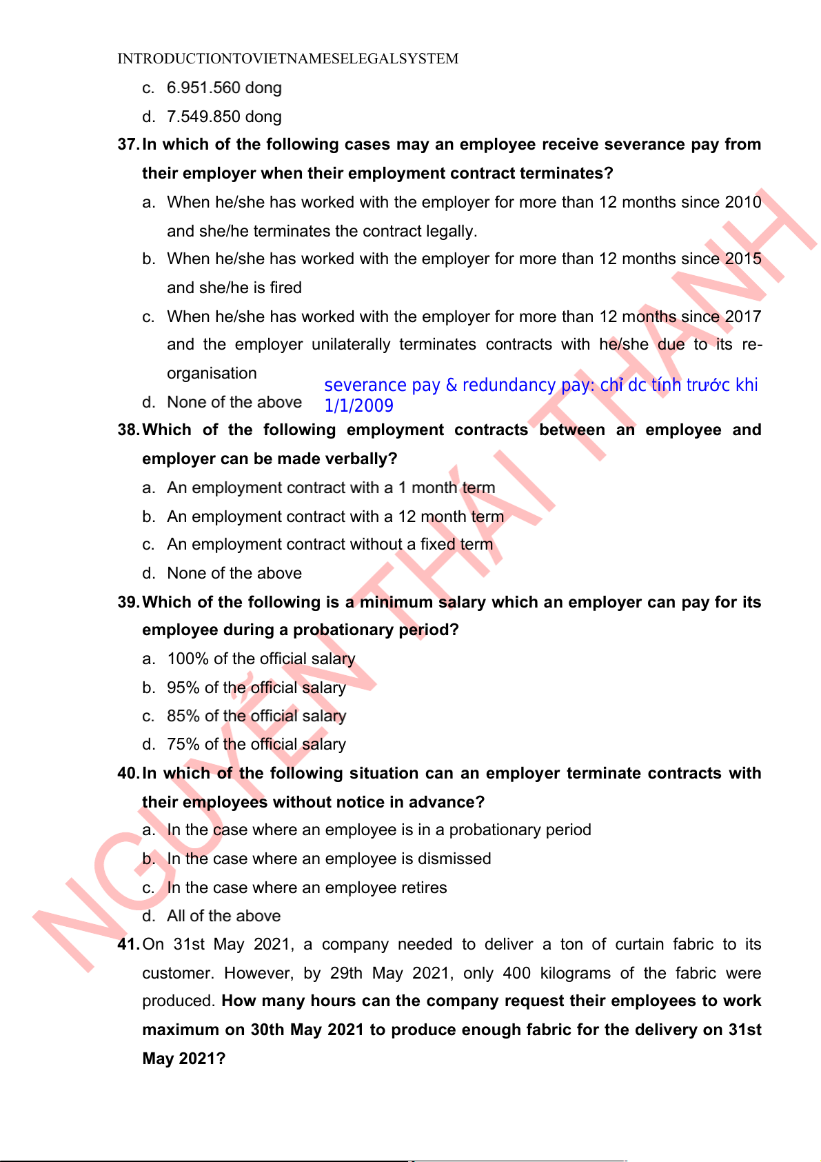 b. 23.760.000 dong severance pay c. 31.680.000 dong redundancy d. None of the above