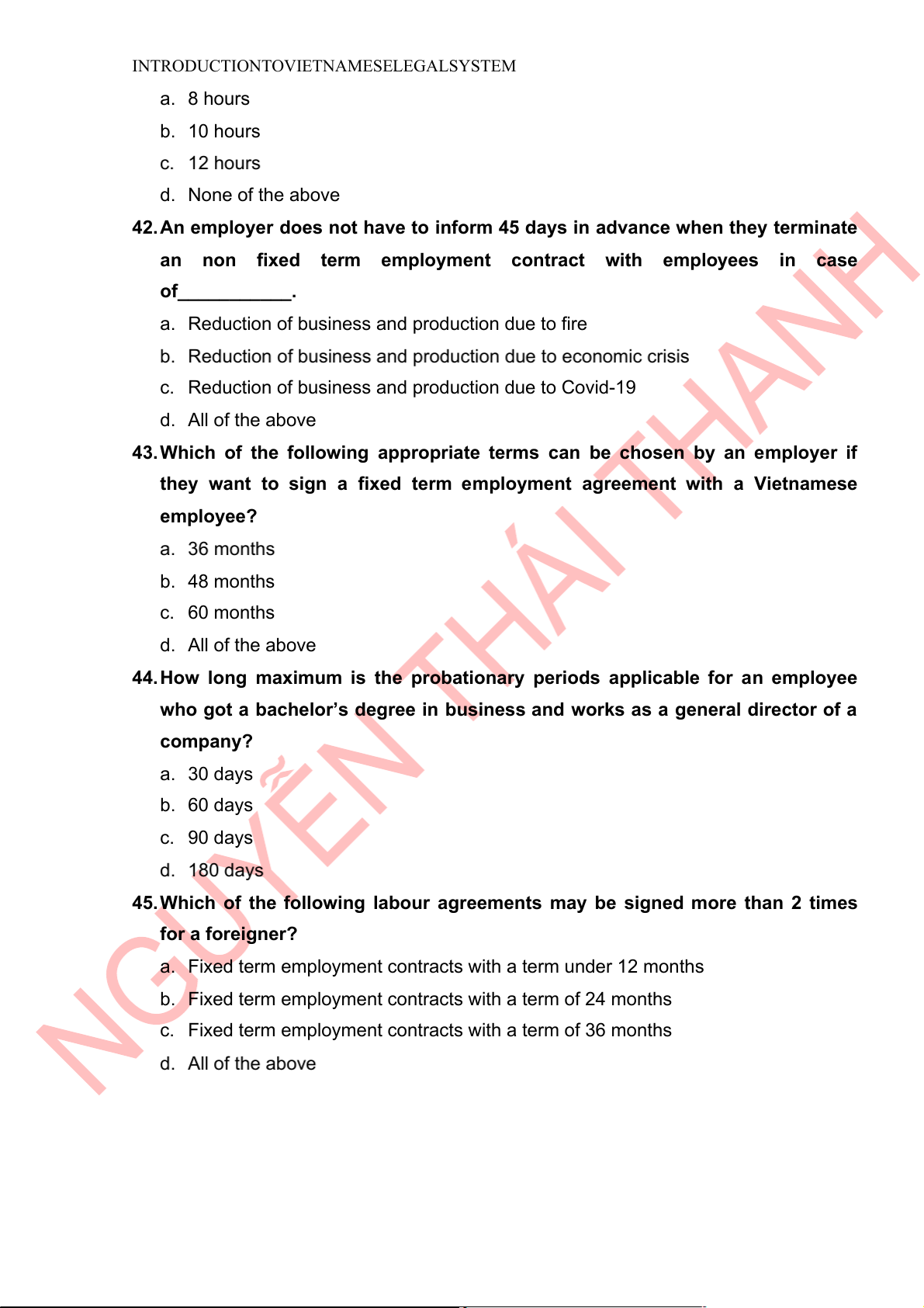 INTRODUCTION TO VIETNAMESE LEGAL SYSTEM a. 8 hours b. 10 hours d. None of the above