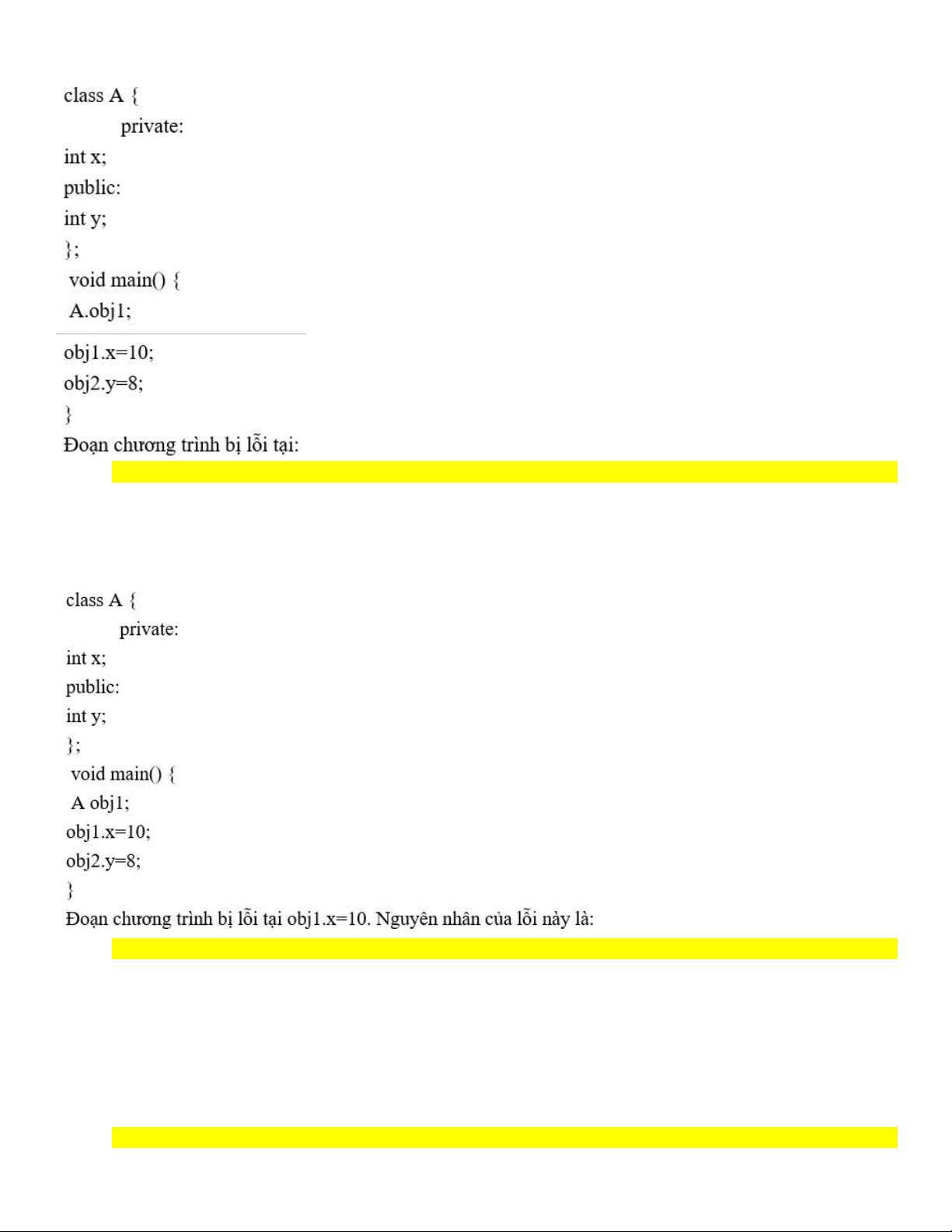 Câu 29. Cho đoạn chương trình sau: Lỗi tại dòng obj1.x=10; Lỗi tại dòng obj2.y=8; Lỗi tại dòng A.obj1; Lỗi tại dòng int x;