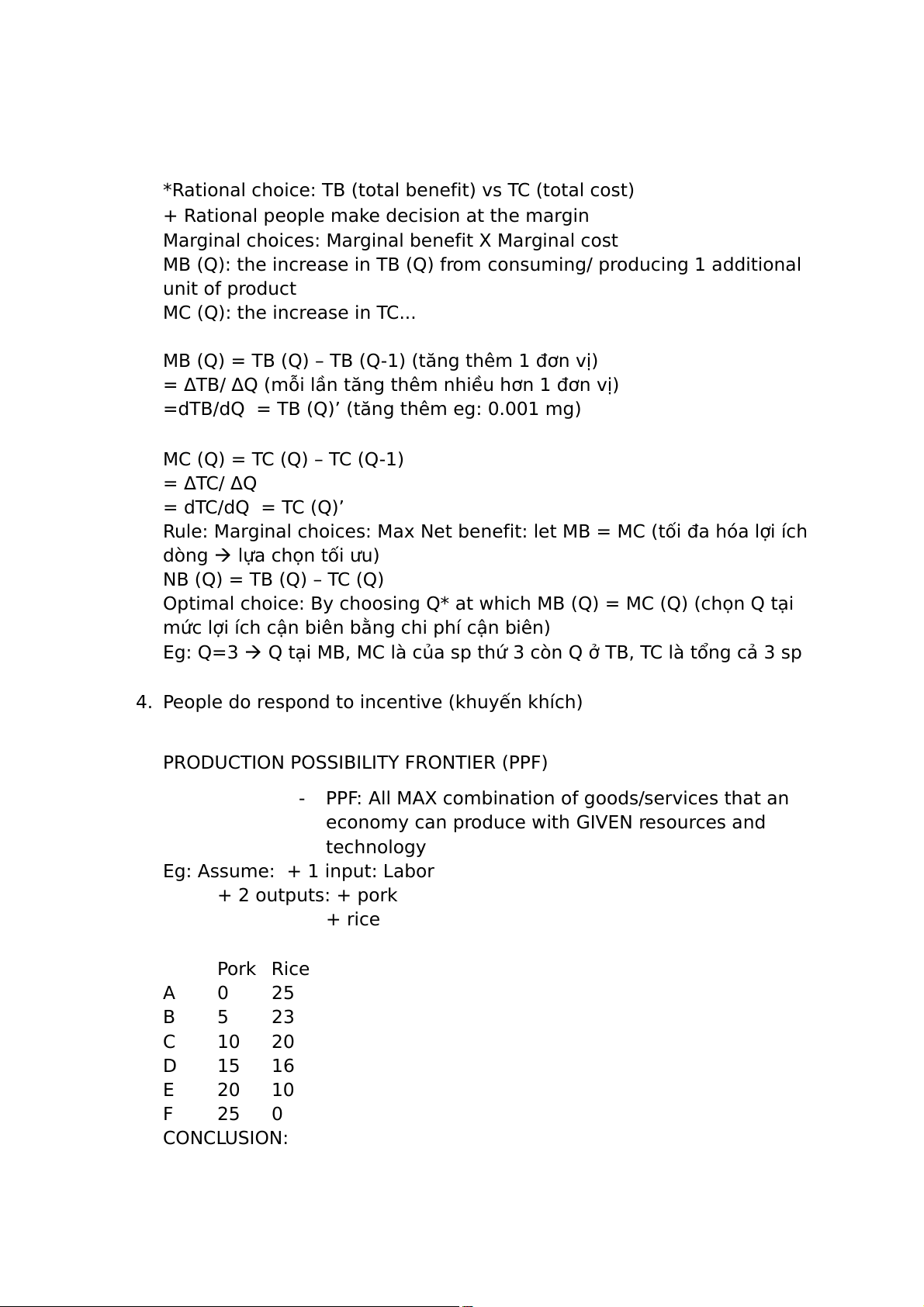 foregone opportunity when u make a choice) vs benefit *eg: resource: 500k; 3h Opt 1: go to cinema Opt 2: go to work + keep 500k + earn 60k Get 560k Opt 3: go to private tutor + keep 500k + earn 200k/1h Get 1100k Go to cinema costs 1100k 3.3. Marginal choices