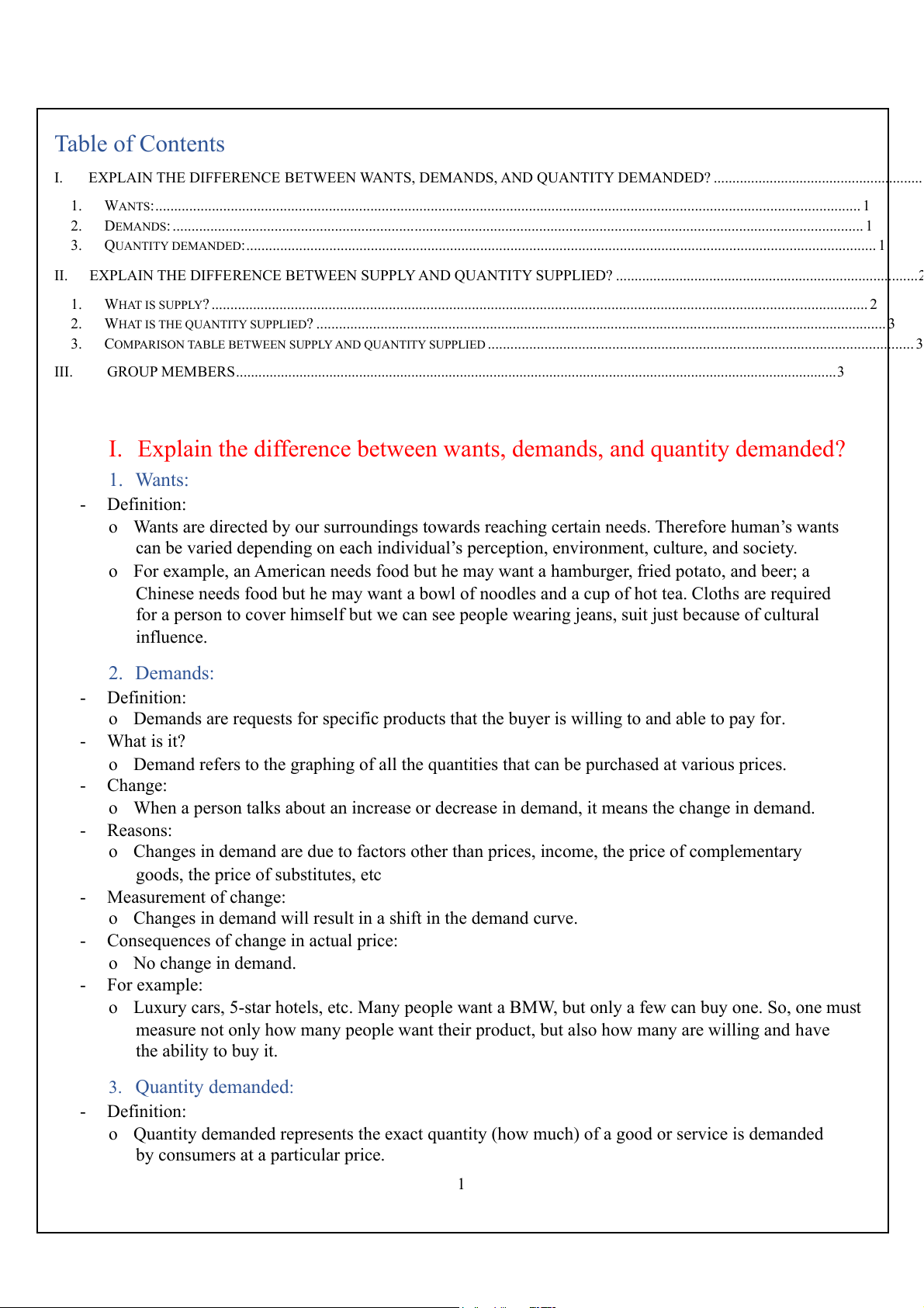 I. Explain the difference between wants, demands, and quantity demanded? 1. Wants: - Definition: