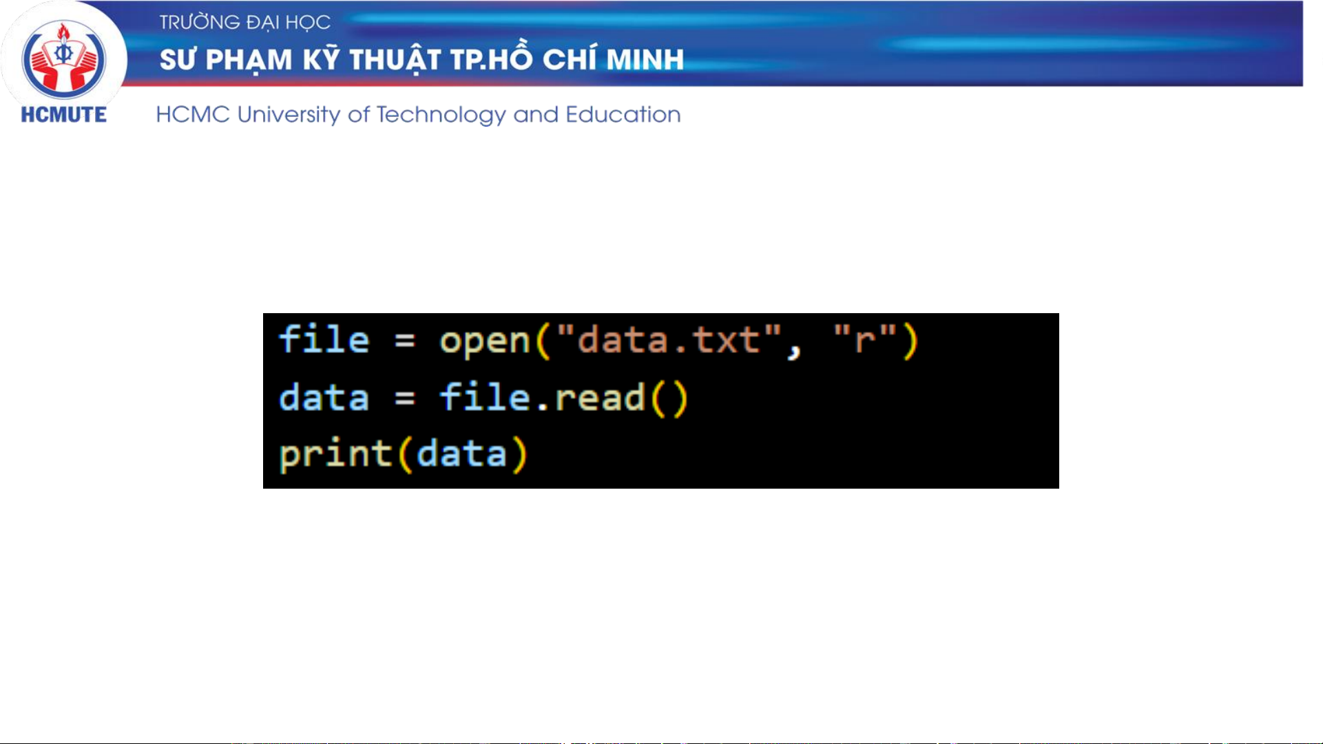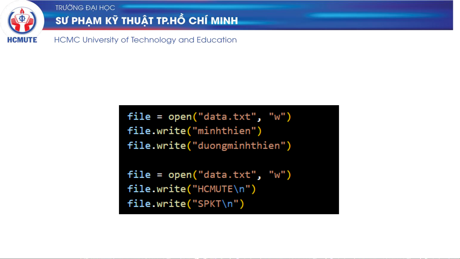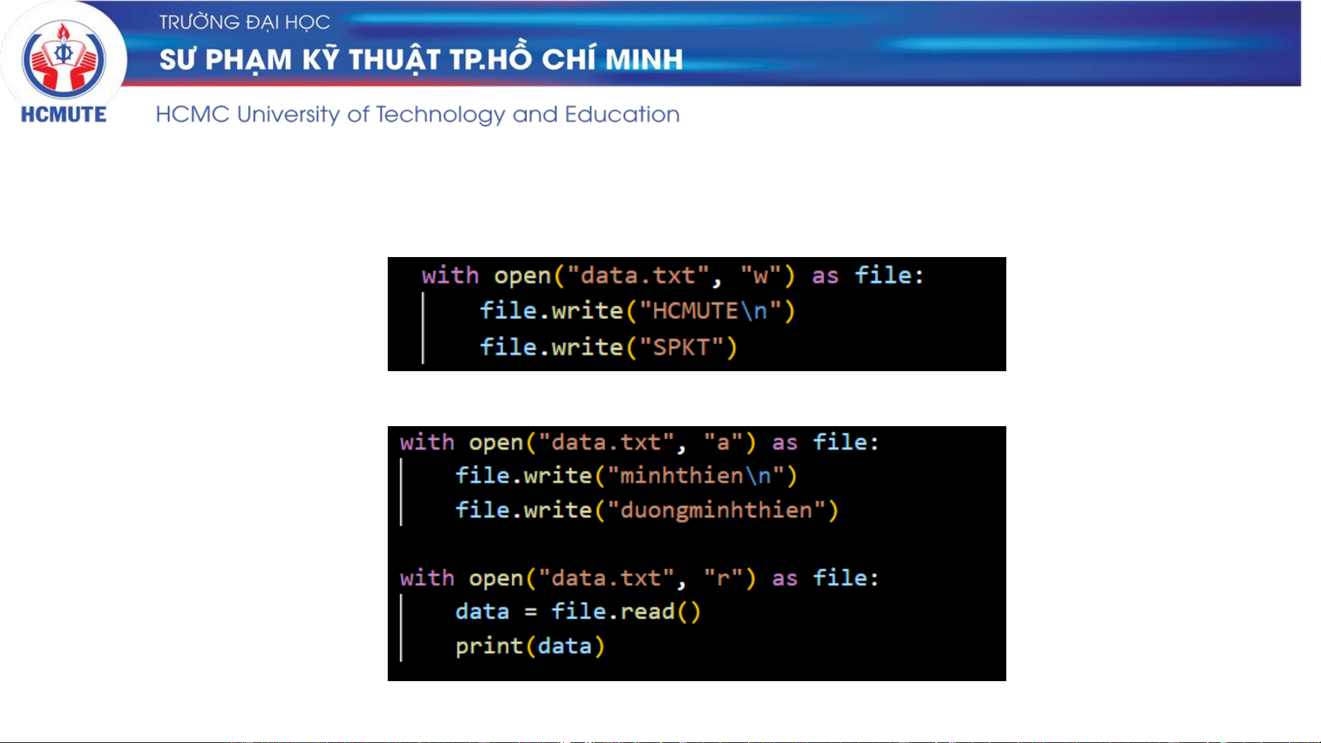 “w”: writing (tạo file mới, ghi đè lên file mới) “r”: reading