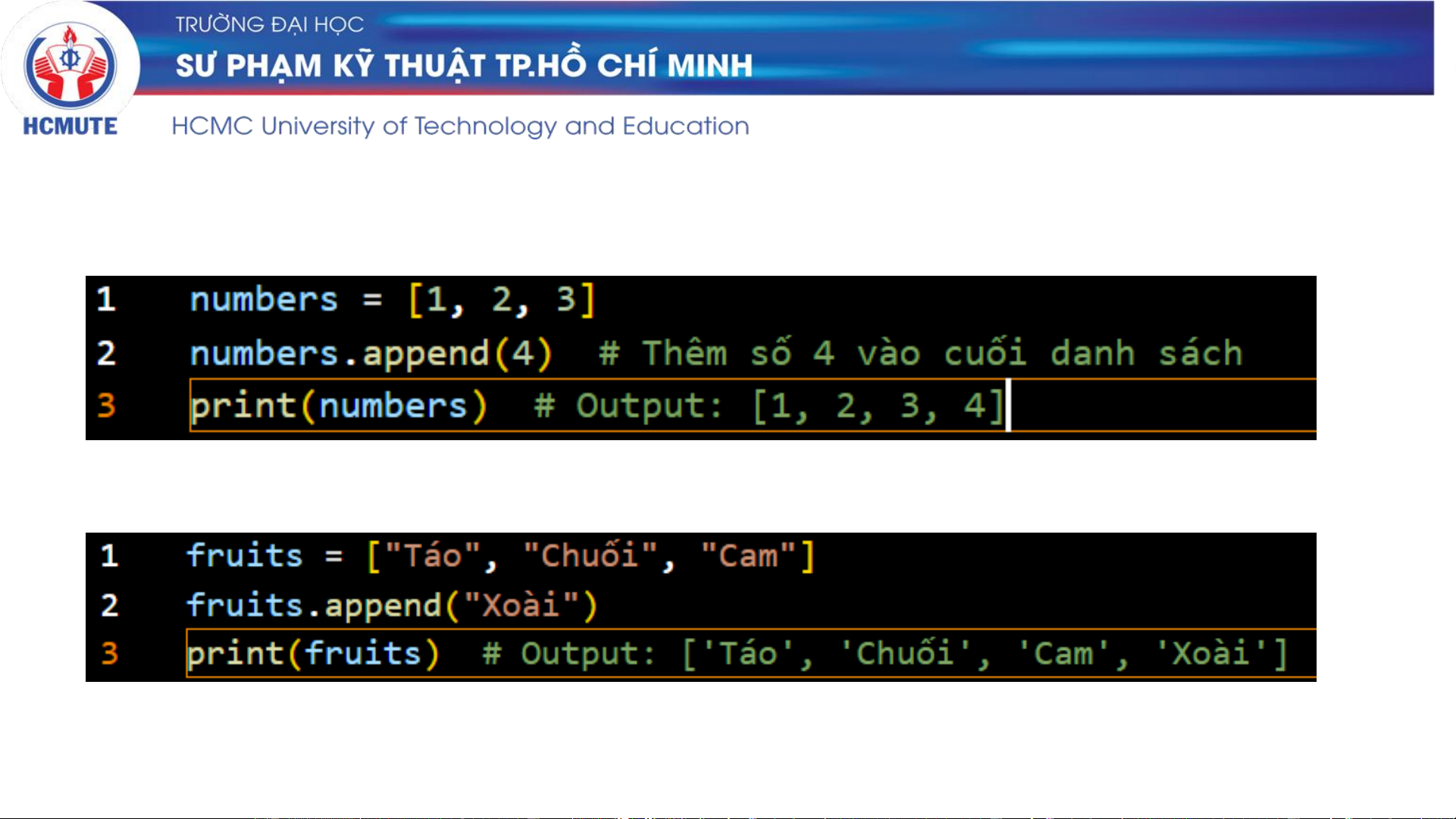 • element là phần tử cần thêm vào danh sách. Lưu ý: