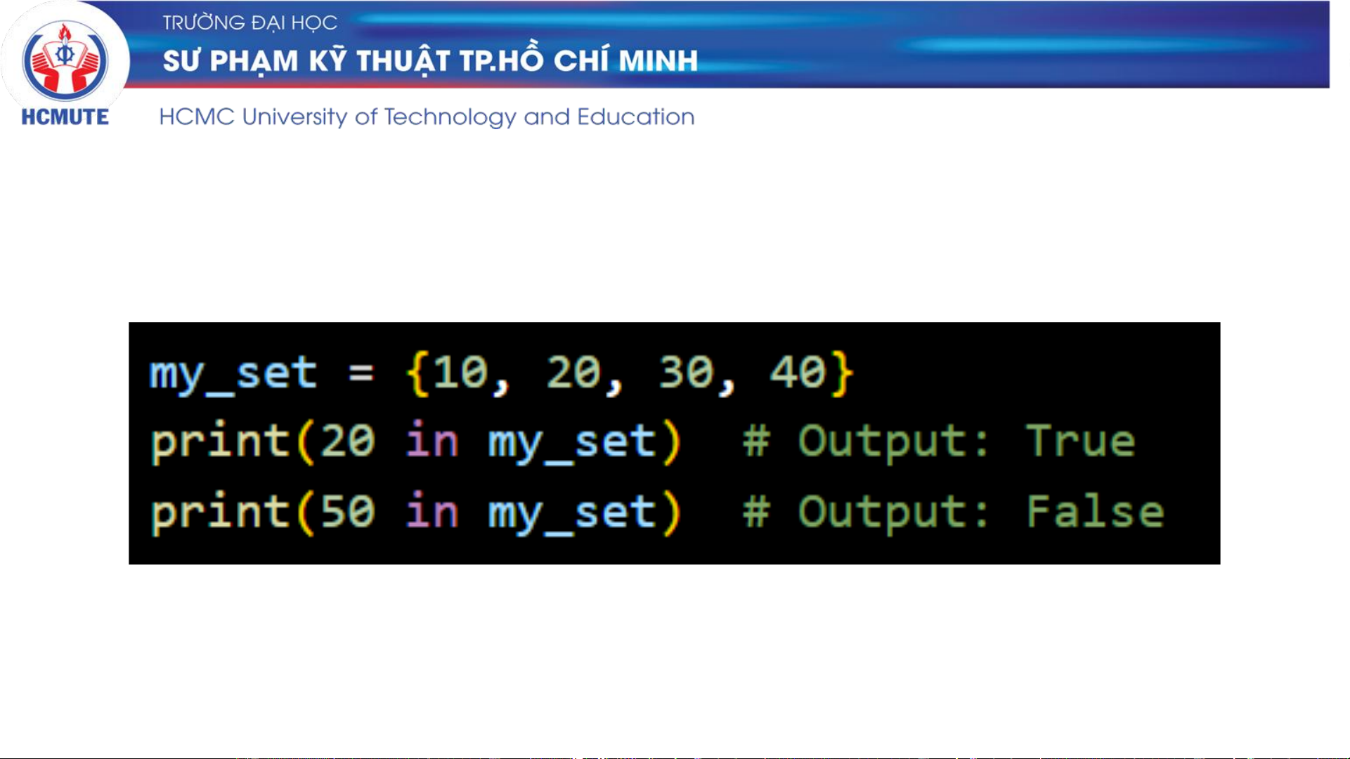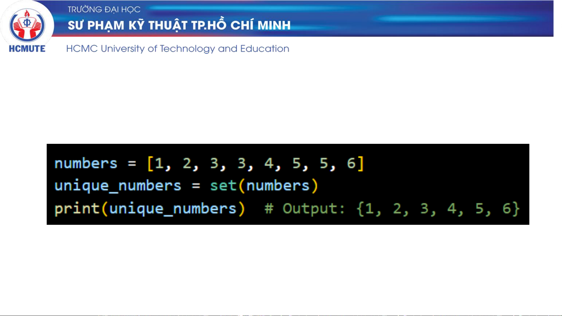 • Nếu có phần tử trùng lặp, Python tự động loại bỏ chúng. Cách 2: Dùng hàm set()