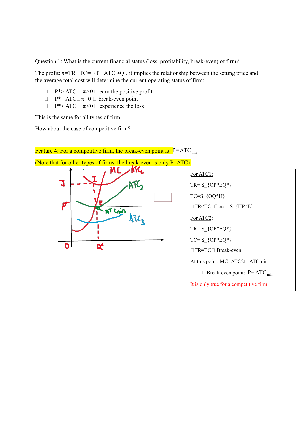 (Note that for other types of firms, the break-even is only P=ATC) For ATC1: TR= S_{OP*EQ*} TC=S_{OQ*IJ} TRFor ATC2: TR= S_{OP*EQ*} TC= S_{OP*EQ*} TR=TC Break-even At this point, MC=ATC2 ATCmin Break-even point: P= ATCmin