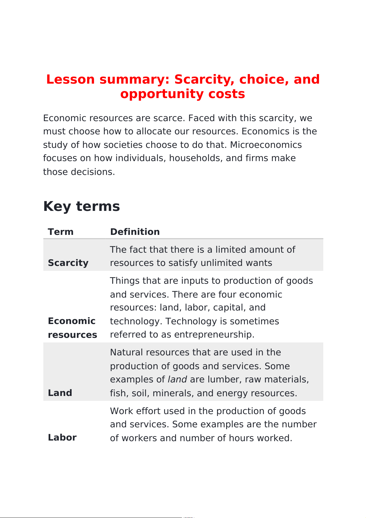 Lesson summary: Scarcity, choice, and opportunity costs