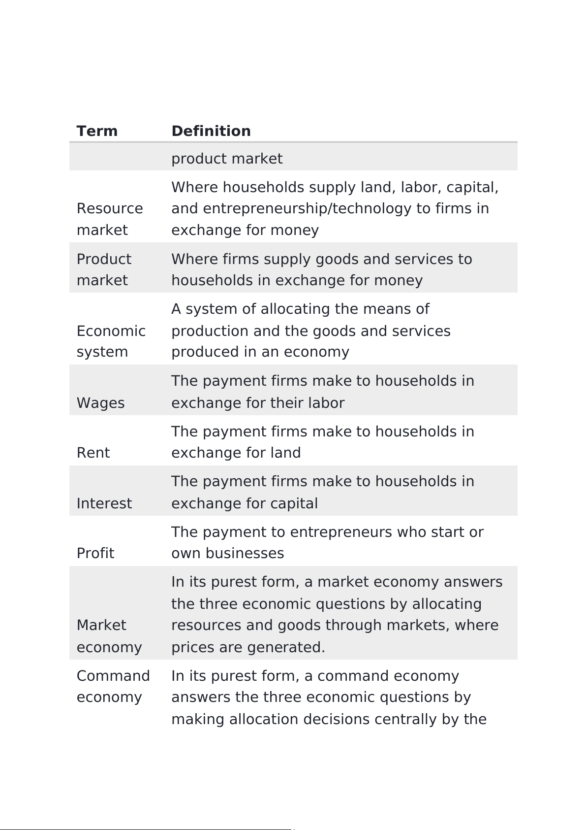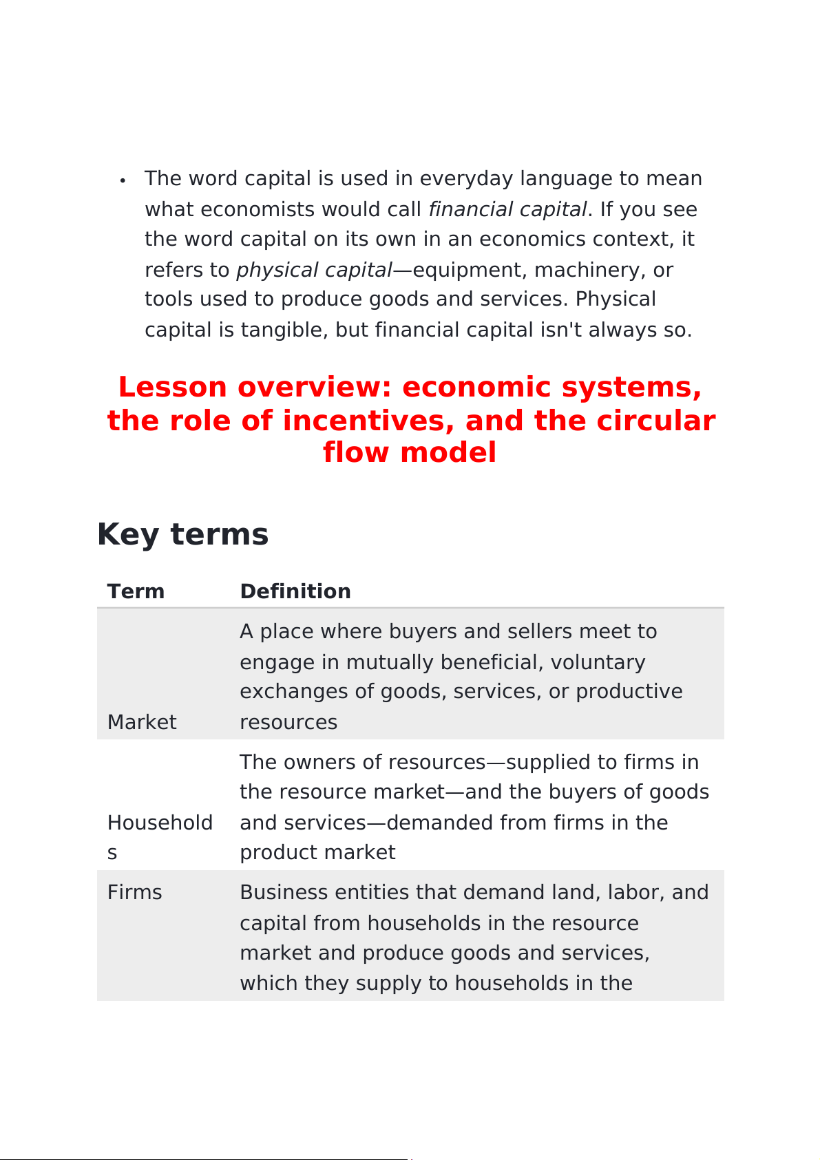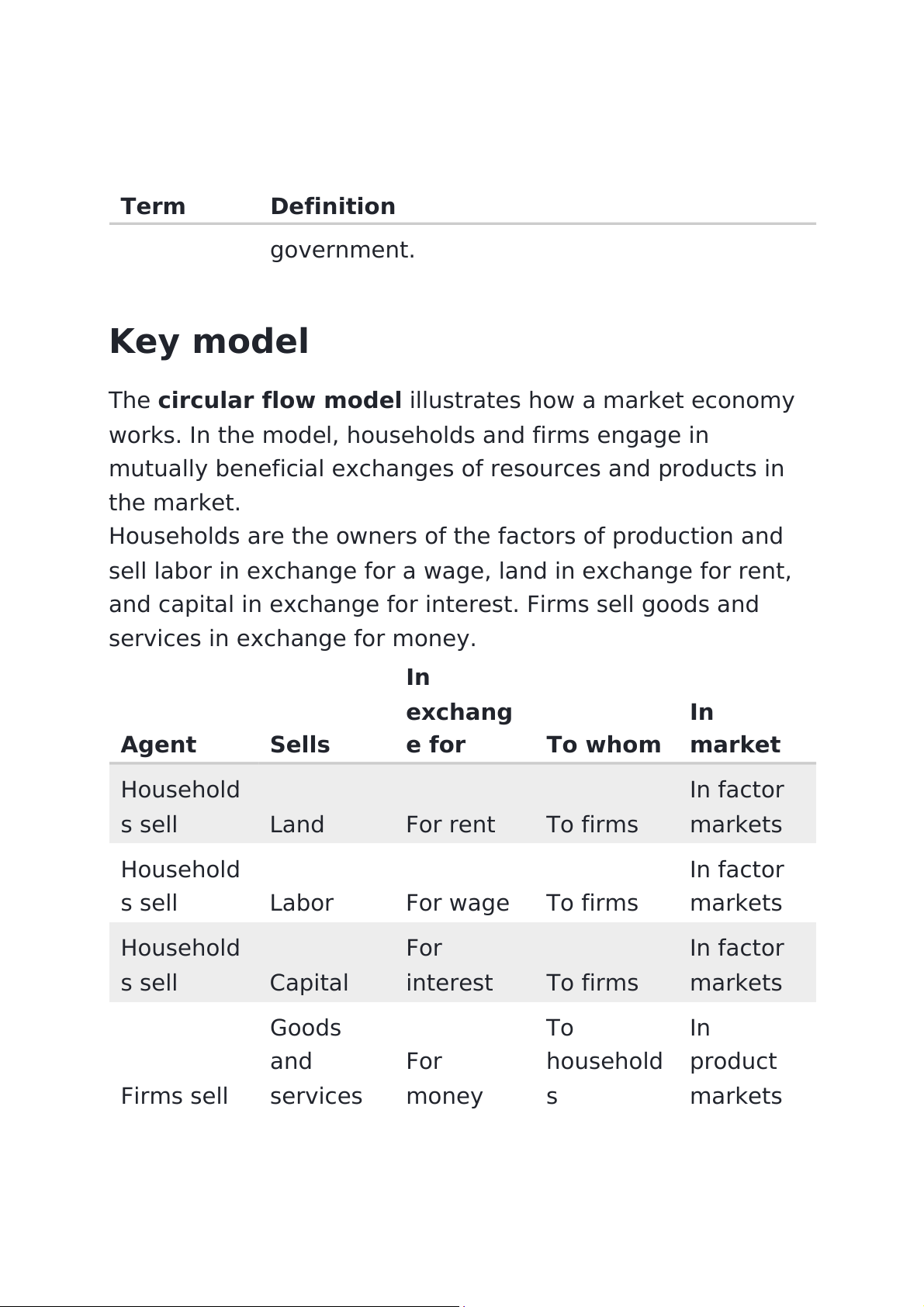 the role of incentives, and the circular flow model Key terms Term Definition