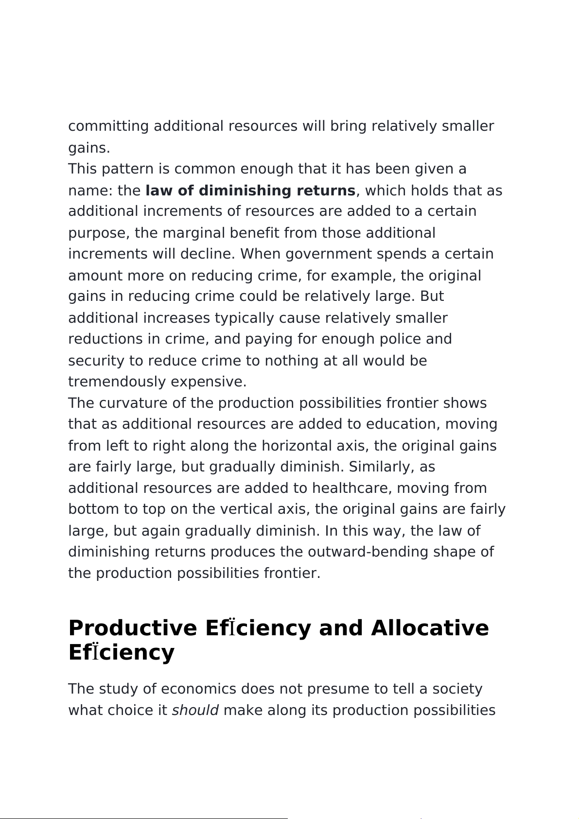 Productive efÏciency means it is impossible to produce more of one good without