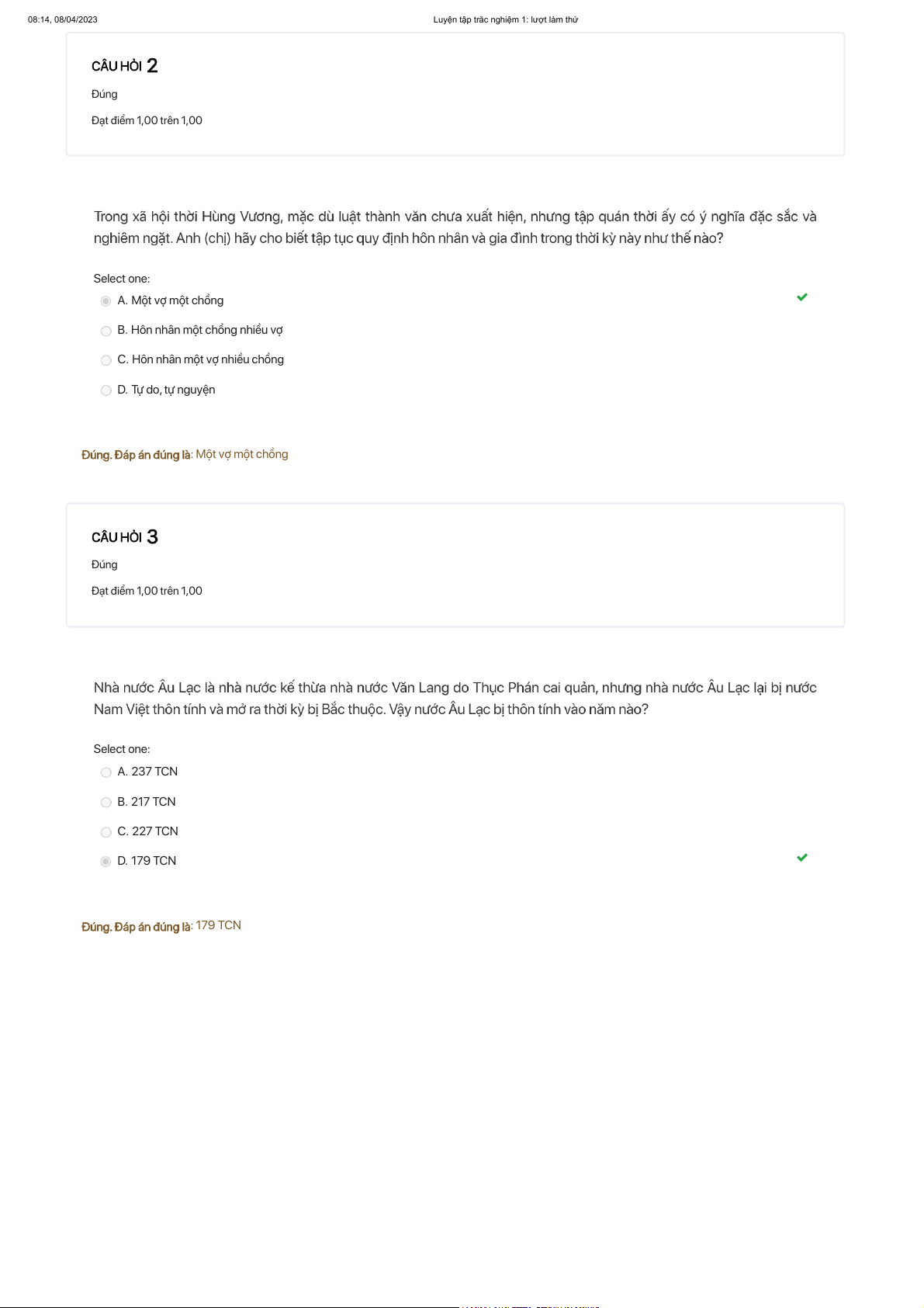 Luyện tập trắc nghiệm 1: lượt làm thử Đúng Đạt điểm 1,00 trên 1,00 Select one: A. Một vợ một chồng
