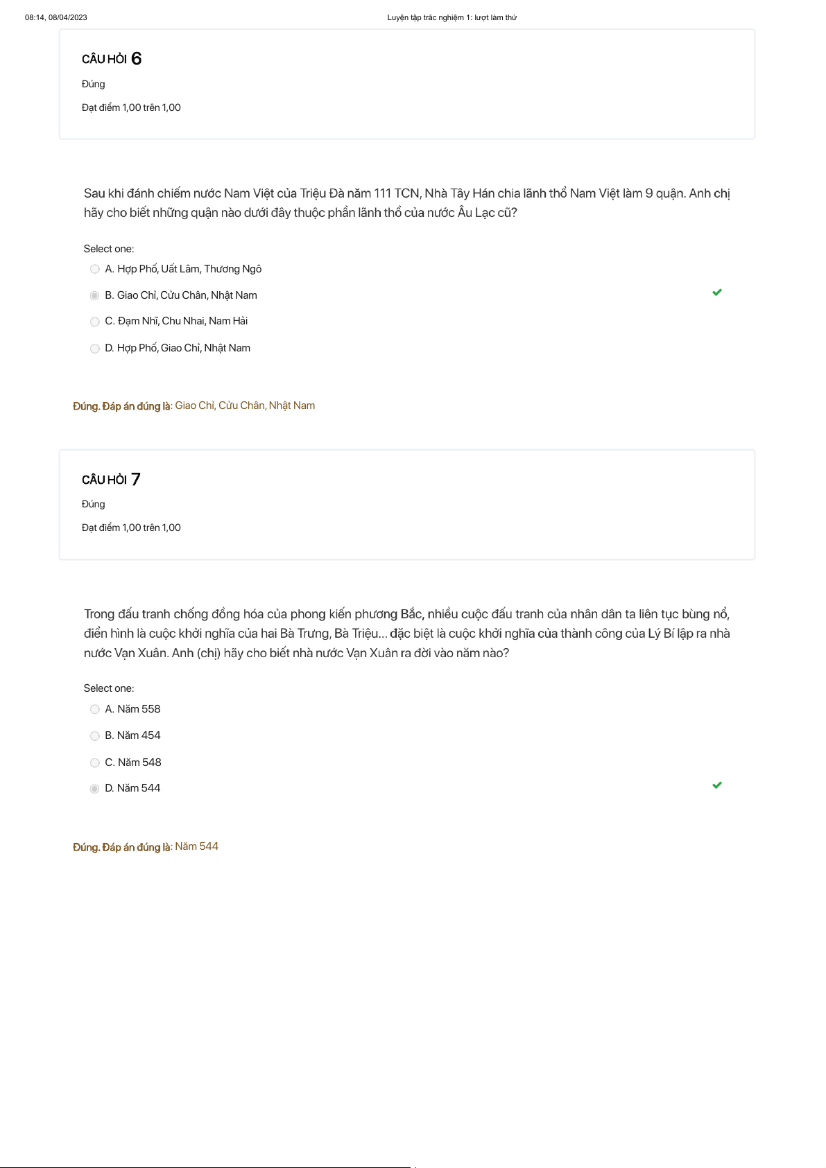 : Giao Chỉ, Cửu Chân, Nhật Nam Đúng Đạt điểm 1,00 trên 1,00 Select one: A. Năm 558 B. Năm 454 C. Năm 548