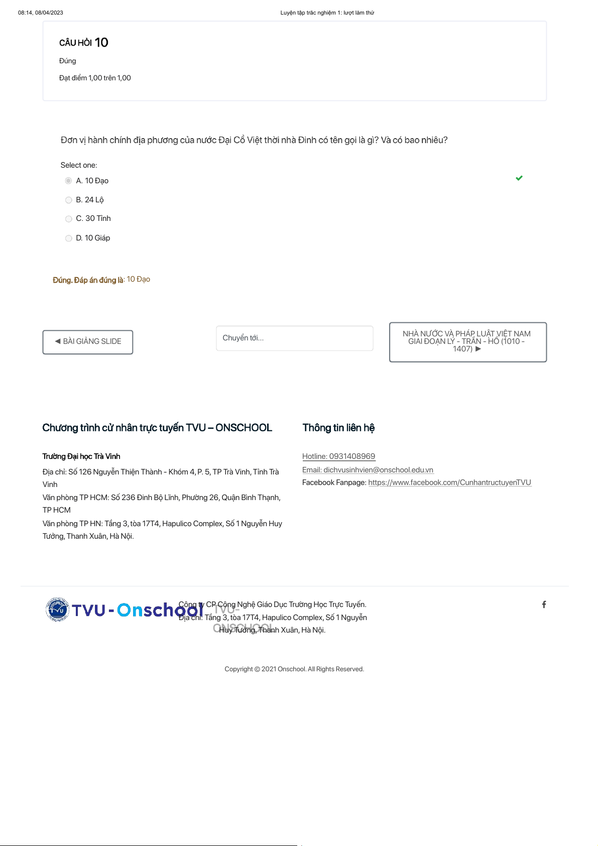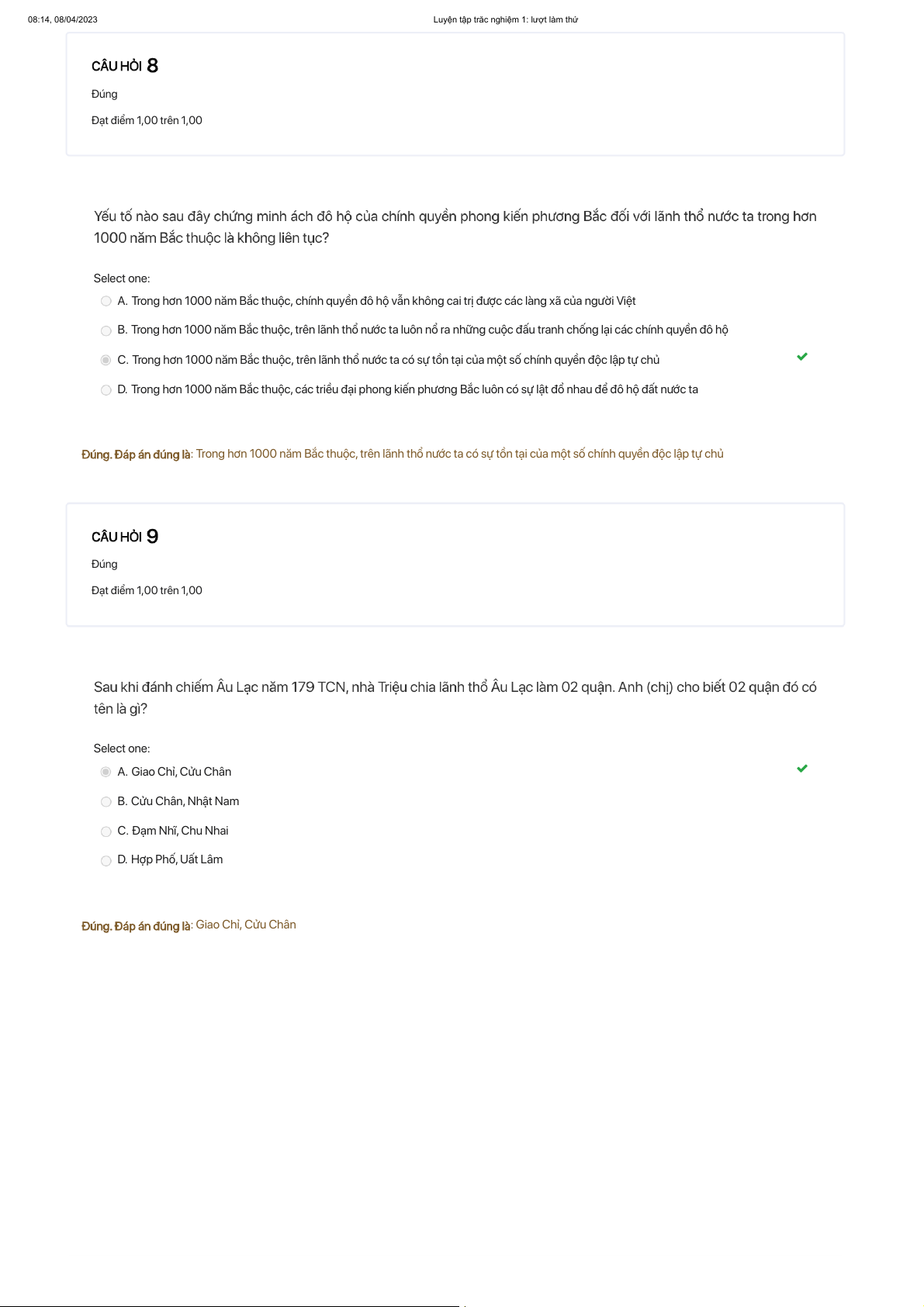 : Trong hơn 1000 năm Bắc thuộc, trên lãnh thổ nước ta có sự tồn tại của một số chính quyền độc lập tự chủ Đúng Đạt điểm 1,00 trên 1,00 Select one: