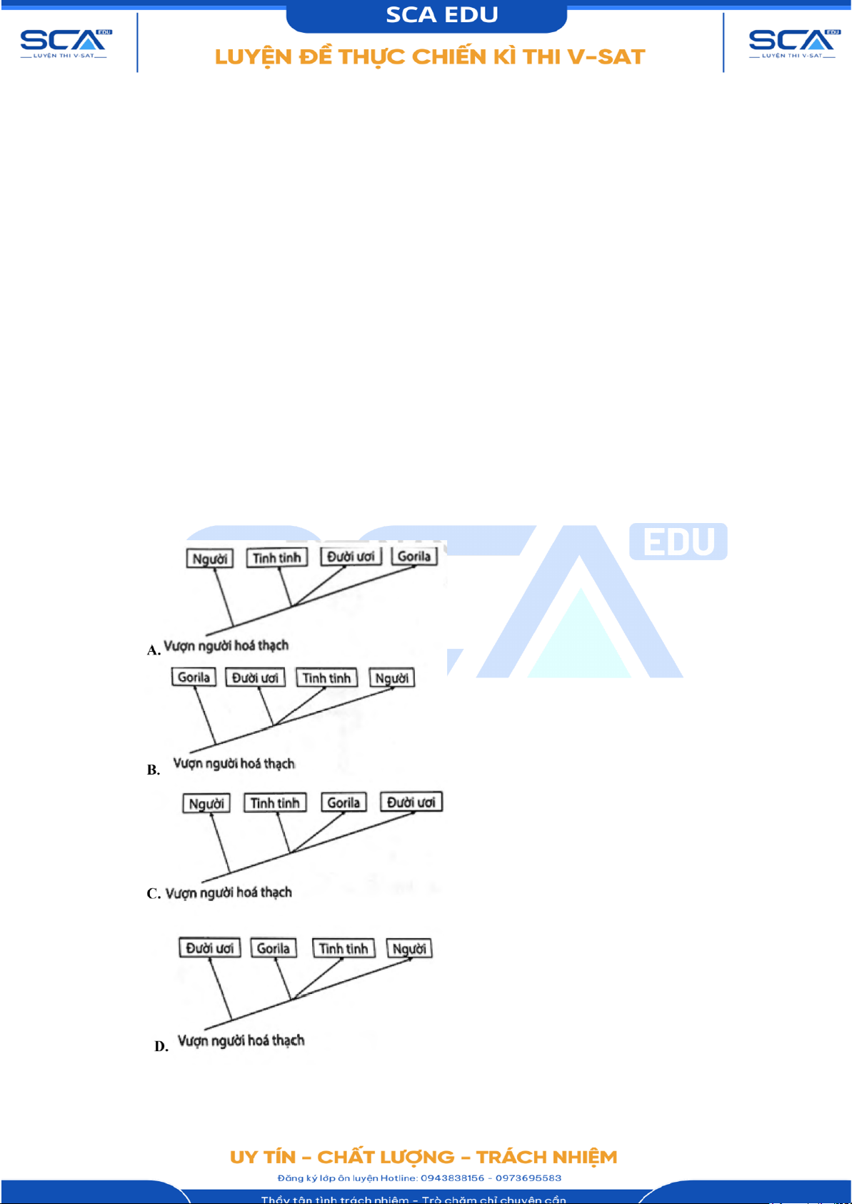 Câu 12. Sơ đồ cây phát sinh chủng loại nào sau đây phản ánh đúng quan hệ nguồn gốc giữa các loài nói trên?