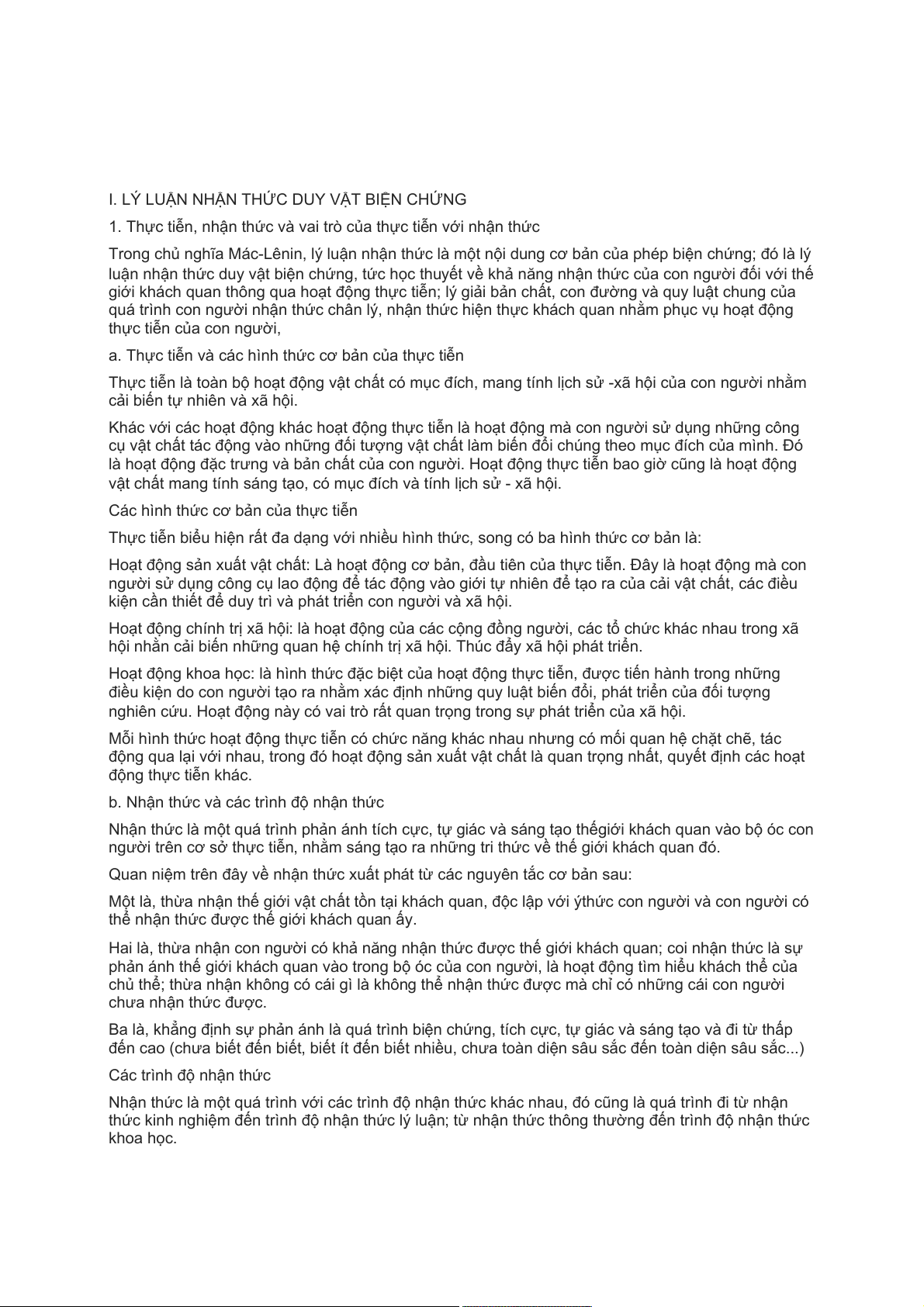 I. LÝ LUẬN NHẬN THỨC DUY VẬT BIỆN CHỨNG
