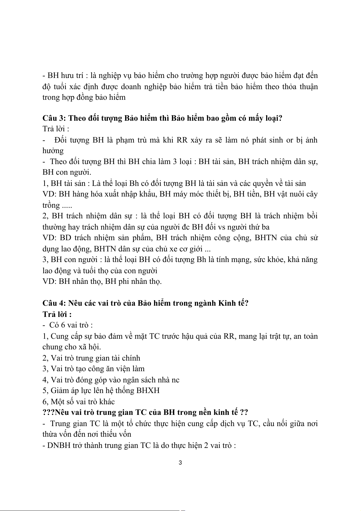 Câu 3: Theo đối tượng Bảo hiểm thì Bảo hiểm bao gồm có mấy loại? Trả lời :