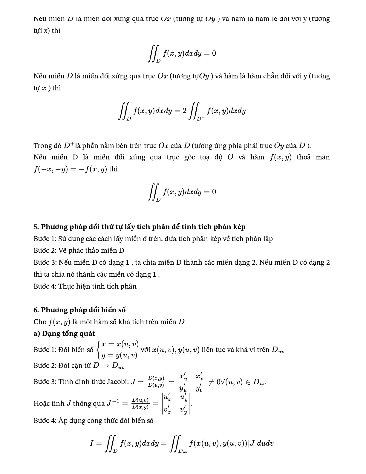 ∣Duvu′JJ−1=D(u,v)xu′yD(x,y)=v′xv′yNếu miền Dlà miển đối xứng qua trục O x(tương tự O y) và hàm là hàm lẻ đối với y (tươngtựi x) thì∬f(x,y)dxdy=0DNếu miền Dlà miền đối xứng qua trục O x(tương tựO y) và hàm là hàm chẵn đối với y (tươngtự x) thì∬f(x,y)dxdy=2∬f(x,y)dxdyDD+Trong đó D+là phần nằm bên trên trục O xcủa D(tương ứng phía phải trục O ycủa D).Nếu miền D là miền đối xứng qua trục gốc toạ độ Ovà hàm f(x,y )thoả mãnf(−x,−y)=−f(x,y )thì∬f(x,y)dxdy=0D5. Phương pháp đổi thứ tự lấy tích phân để tính tích phân képBước 1: Sử dụng các cách lấy miền ở trên, đưa tích phân kép về tích phân lặpBước 2: Vẽ phác thảo miền DBước 3: Nếu miền D có dạng 1 , ta chia miền D thành các miền dạng 2. Nếu miền D có dạng 2thì ta chia nó thành các miền có dạng 1 .Bước 4: Thực hiện tính tích phân6. Phương pháp đổi biến sốCho f(x,y )là một hàm số khả tích trên miền Da) Dạng tổng quátx=x(u,v)Bước 1: Đổi biến số { với x(u,v),y(u,v )liên tục và khả vi trên Dy=y(u,v)uvBước 2: Đổi cận từ D→Duvx′Bước 3: Tính định thức Jacobi: J=D(x,y)ux′vD(u,v)=≠0∀(u,v)∈Duvy′uy′vHoặc tính thông qua .Bước 4: Áp dụng công thức đổi biến số b) Trong tọa độ cực