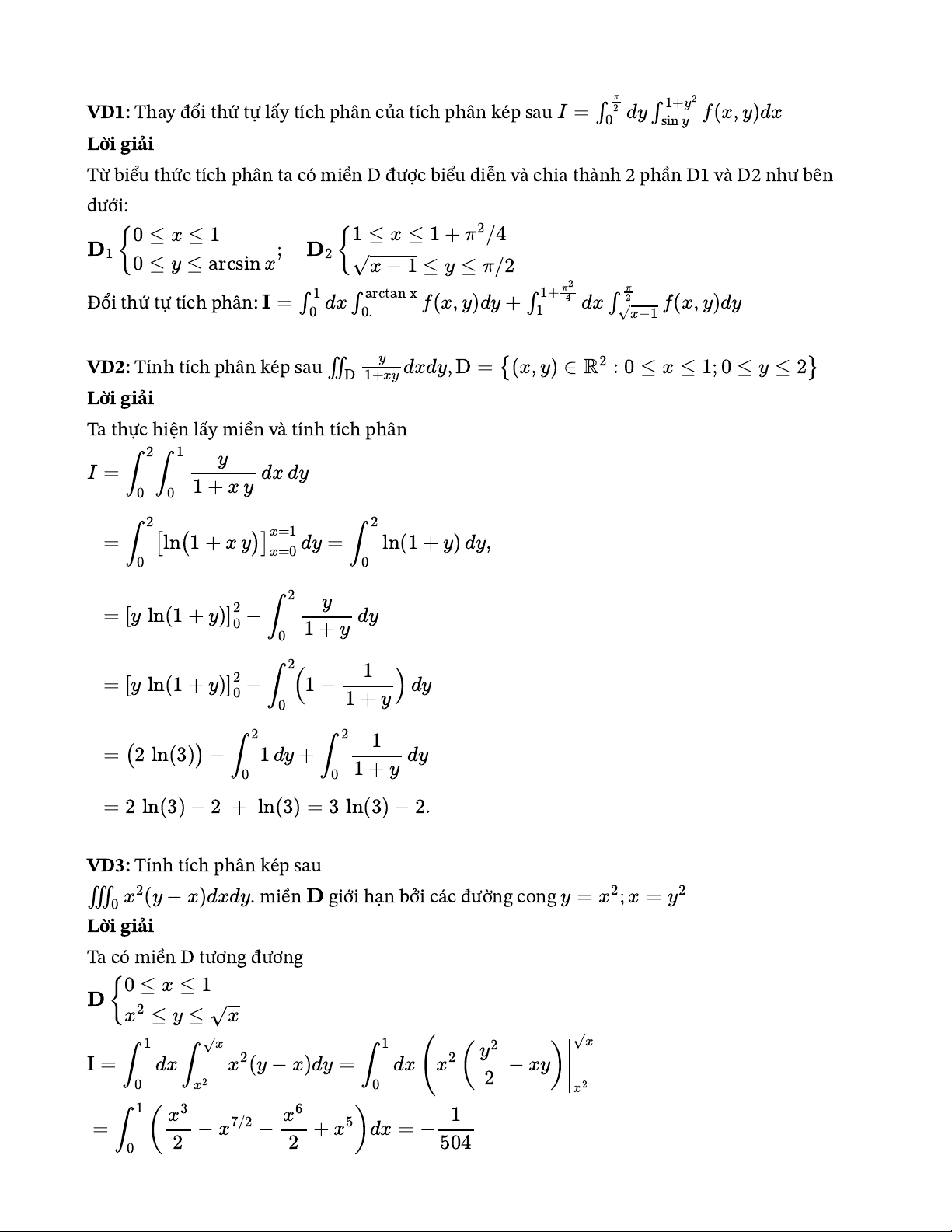 ∣II. Ví dụ minh họaπVD1: Thay đổi thứ tự lấy tích phân của tích phân kép sau I=∫20dy∫1+y2sinyf(x,y)dxLời giảiTừ biểu thức tích phân ta có miền D được biểu diễn và chia thành 2 phần D1 và D2 như bêndưới:0≤x≤11≤x≤1+π2/4D1{;D2{0≤y≤arcsinx√x−1≤y≤π/2πĐổi thứ tự tích phân: I=∫120dx∫arctanx0.f(x,y)dy+∫1+π241dx∫f(x,y)dy√x−1VD2: Tính tích phân kép sau ∬yD1+xydxdy,D={(x,y)∈R2:0≤x≤1;0≤y≤2}Lời giảiTa thực hiện lấy miền và tính tích phân21yI=∫∫dxdy001+xy22=∫[ln(1+xy)]x=1x=0dy=∫ln(1+y)dy,002y=[yln(1+y)]20−∫dy01+y21=[yln(1+y)]20−∫(1−)dy01+y221=(2ln(3))−∫1dy+∫dy001+y=2ln(3)−2+ln(3)=3ln(3)−2.VD3: Tính tích phân kép sau∭. miền giới hạn bởi các đường cong 0x2(y−x)dxdyDy=x2;x=y2Lời giảiTa có miền D tương đương0≤x≤1D{x2≤y≤√x1√x1y2√xI=∫dx∫x2(y−x)dy=∫dx(x2(−xy)0x202x21x3x61=∫(−x7/2−+x5)dx=−022504