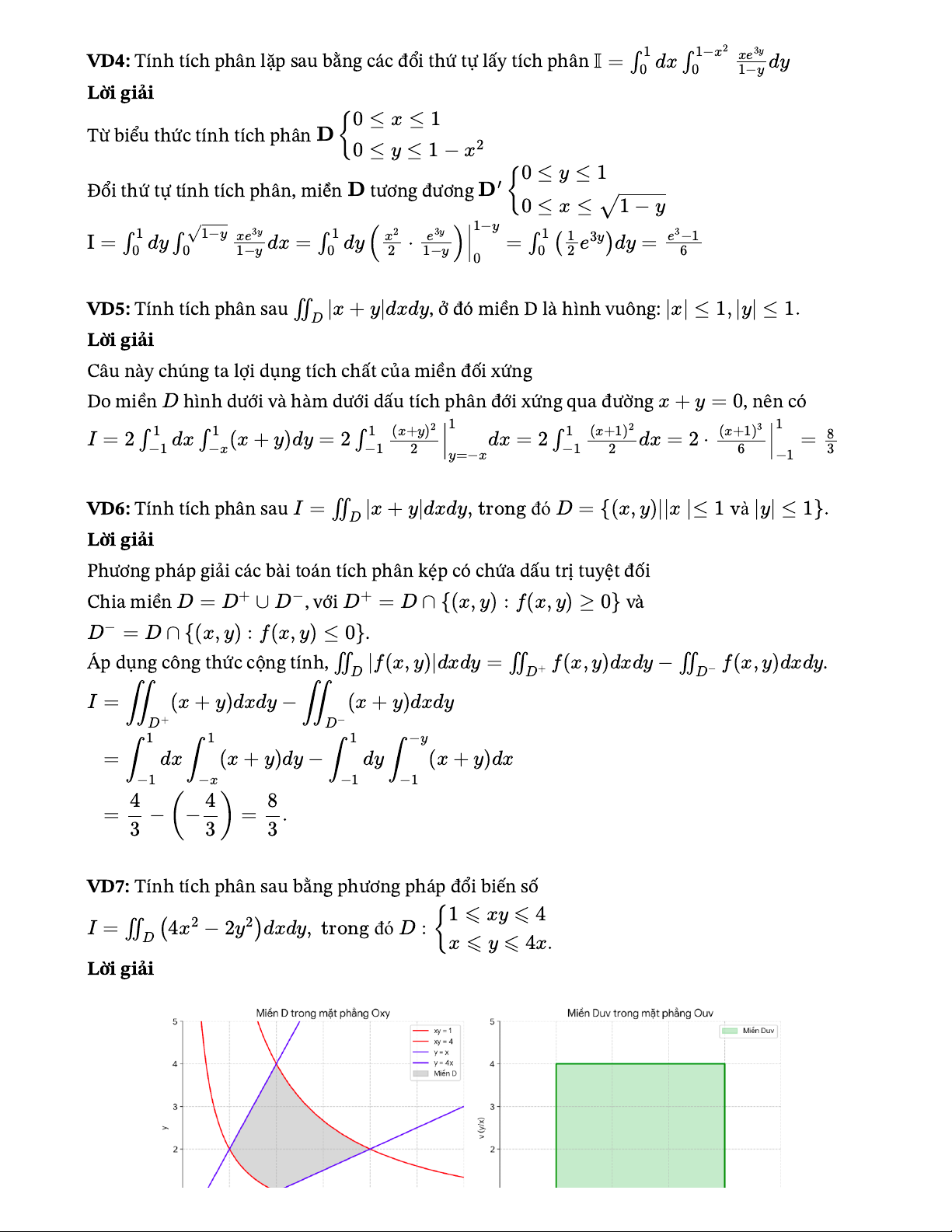 I = ∬D (4x2 − 2y2)dxdy, trong đó D : ∣xdy,trongđó D={(x,y)||x∣≤1 và |{(x,y):f(x,y)≥0}D−=D∩{(x,y):f(x,y)≤0}∬D|f(x,y)|dxdy=∬D+f(x,y)dxdy−∬D−f(x,{x⩽y⩽4x.∬D|x+y|dxdyD11I=2∫1(x+y)2(x+1)2−1dx∫1−x(x+y)dy=2∫1−12dx=2∫1=8yVD4: Tính tích phân lặp sau bằng các đổi thứ tự lấy tích phân I=∫1xe3y0dx∫1−x201−ydyLời giải0≤x≤1Từ biểu thức tính tích phân D{0≤y≤1−x20≤y≤1Đổi thứ tự tính tích phân, miề̀n Dtương đương D′{0≤x≤√1−y1−yI=∫1xe3y0dy∫√1−y01−ydx=∫10dy(x22⋅e3y1−y)=∫100(12e3y)dy=e3−16VD5: Tính tích phân sau , ở đó miền D là hình vuông: |x|≤1,|y|≤1. Lời giảiCâu này chúng ta lợi dụng tích chất của miền đối xứngDo miền hình dưới và hàm dưới dấu tích phân đới xứng qua đường x+y=,0 nên có=−x−12dx=2⋅(x+1)36−13VD6: Tính tích phân sau y|≤1}.Lời giảiPhương pháp giải các bài toán tích phân kẹ́p có chứa dấu trị tuyệt đốiChia miền , với và.Áp dụng công thức cộng tính, y)dxd.yI=∬D+VD7: Tính tích phân sau bằng phương pháp đổi biến sốLời giải