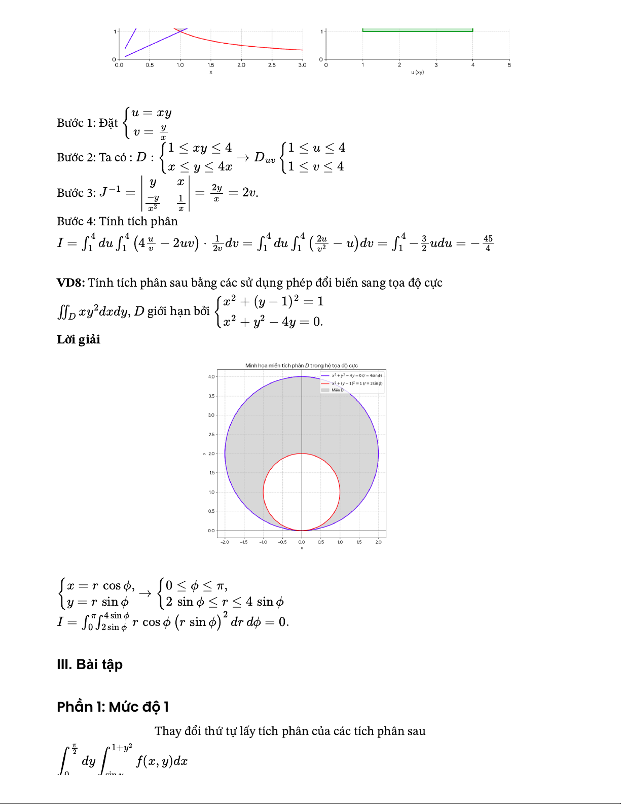 ∣4uv−2D→{2siu=xyBước 1: Đặt {v=yx1≤xy≤41≤u≤4Bước 2: Ta có : D:{→Duv{x≤y≤4x1≤v≤4yxBước 3: J−1=−y=2y.1x=2vx2xBước 4: Tính tích phânuv)⋅12vdv=∫41du∫41(2uv2−u)dv=∫41−32udu=−454VD8: Tính tích phân sau bằng các sử dụng phép đổi biến sang tọa độ cực giới hạn bởi {x2+y2−4y=0.Lời giảinϕ≤r≤4sinϕI=∫π0∫4sinϕ2sinϕrcosϕ(rsinϕ)2drdϕ=0.III. Bài tậpPhần 1: Mức độ 1Câu 1 [ID:6031].Thay đổi thứ tự lấy tích phân của các tích phân sau 1 6 0 ≤ 2y y = π8 2+4