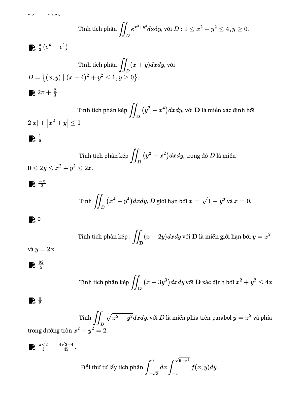 3 ∣≤x22x925+4√4∫∫0sinyCâu 2 [ID:6755].Tính tích phân ∬ex2+y2dxd,y với D:1≤x2+y2≤4,y≥.0Dπ2(e4−e1)Câu 3 [ID:6786].Tính tích phân ∬(x+y)dxd,y vớiDD={(x,y)∣(x−4)2+y2≤1,y≥0.}2π+23Câu 4 [ID:6813].Tính tích phân kép ∬(y2−x4)dxd,y với Dlà miền xác định bởiD2|x|+x2+y≤1Câu 5 [ID:6839].Tính tích phân kép ∬(y2−x2)dxd,y trong đó Dlà miềnD+y2≤2.x−π2Câu 6 [ID:6845].Tính ∬(x4−y4)dxdy, Dgiới hạn bởi x=√1−y2 và x=.0D0Câu 7 [ID:6592].Tính tích phân kép : ∬(x+2y)dxd yvới Dlà miền giới hạn bởi y=x2Dvà Câu 8 [ID:6594].Tính tích phân kép ∬(x+3y3)dxd yvới Dxác định bởi x2+y2≤4xDCâu 9 [ID:6583].Tính ∬√x2+y2dxd,y với Dlà miền phía trên parabol y=x2 và phíaDtrong đường tròn x2+y2=.2π√2.5Câu 10 [ID:6575].0√6−x2Đổi thứ tự lấy tích phân ∫dx∫f(x,y)d.y−√3−x I = ∫ √3 dy ∫ 0 . 0