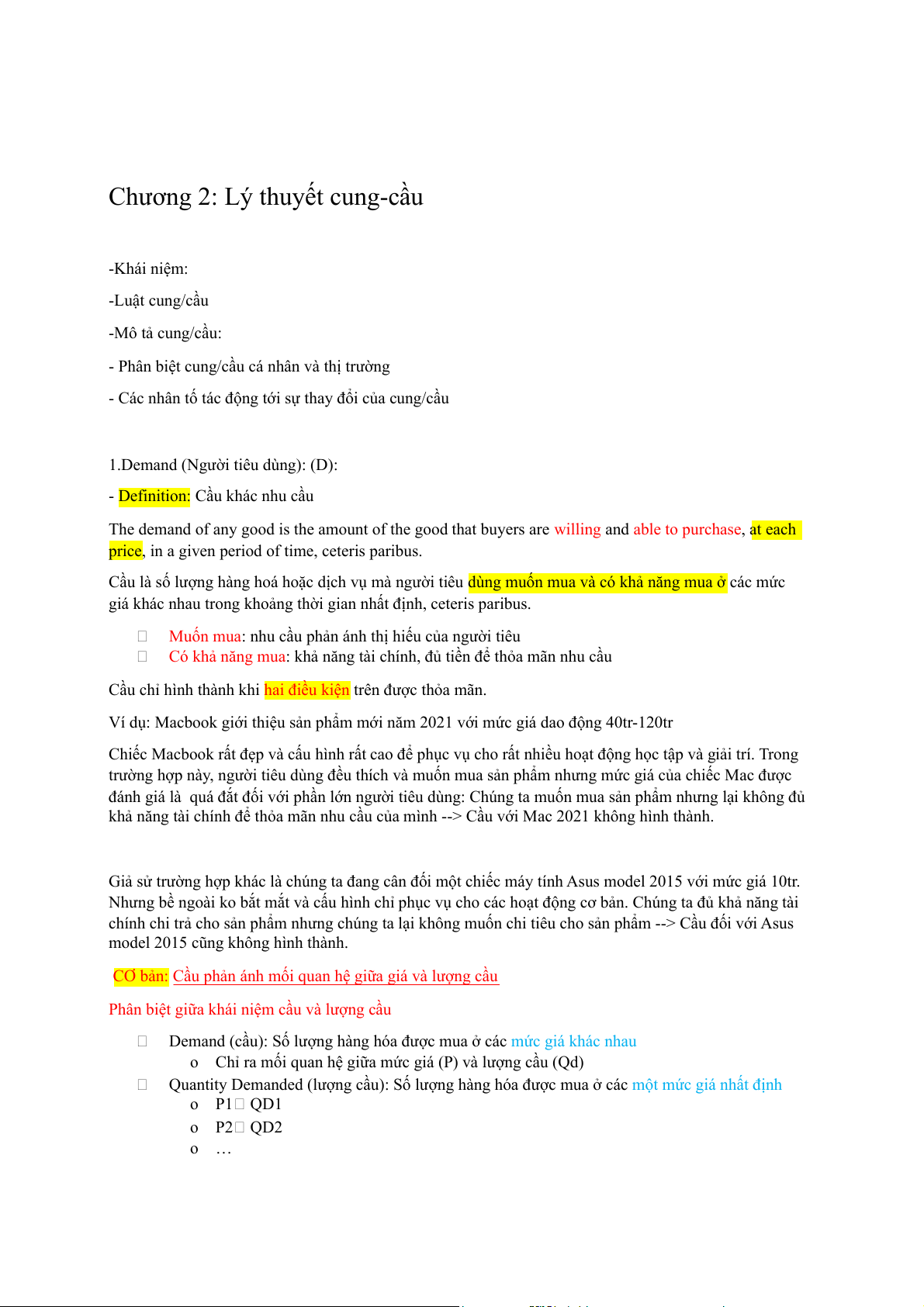 Chương 2: Lý thuyết cung-cầu -Khái niệm: -Luật cung/cầu -Mô tả cung/cầu: