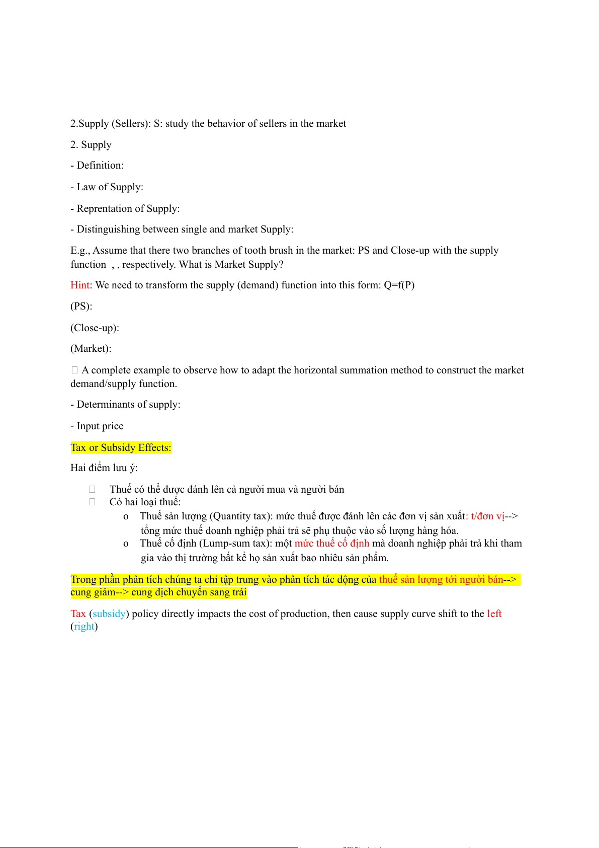 2.Supply (Sellers): S: study the behavior of sellers in the market 2. Supply - Definition: - Law of Supply: - Reprentation of Supply: