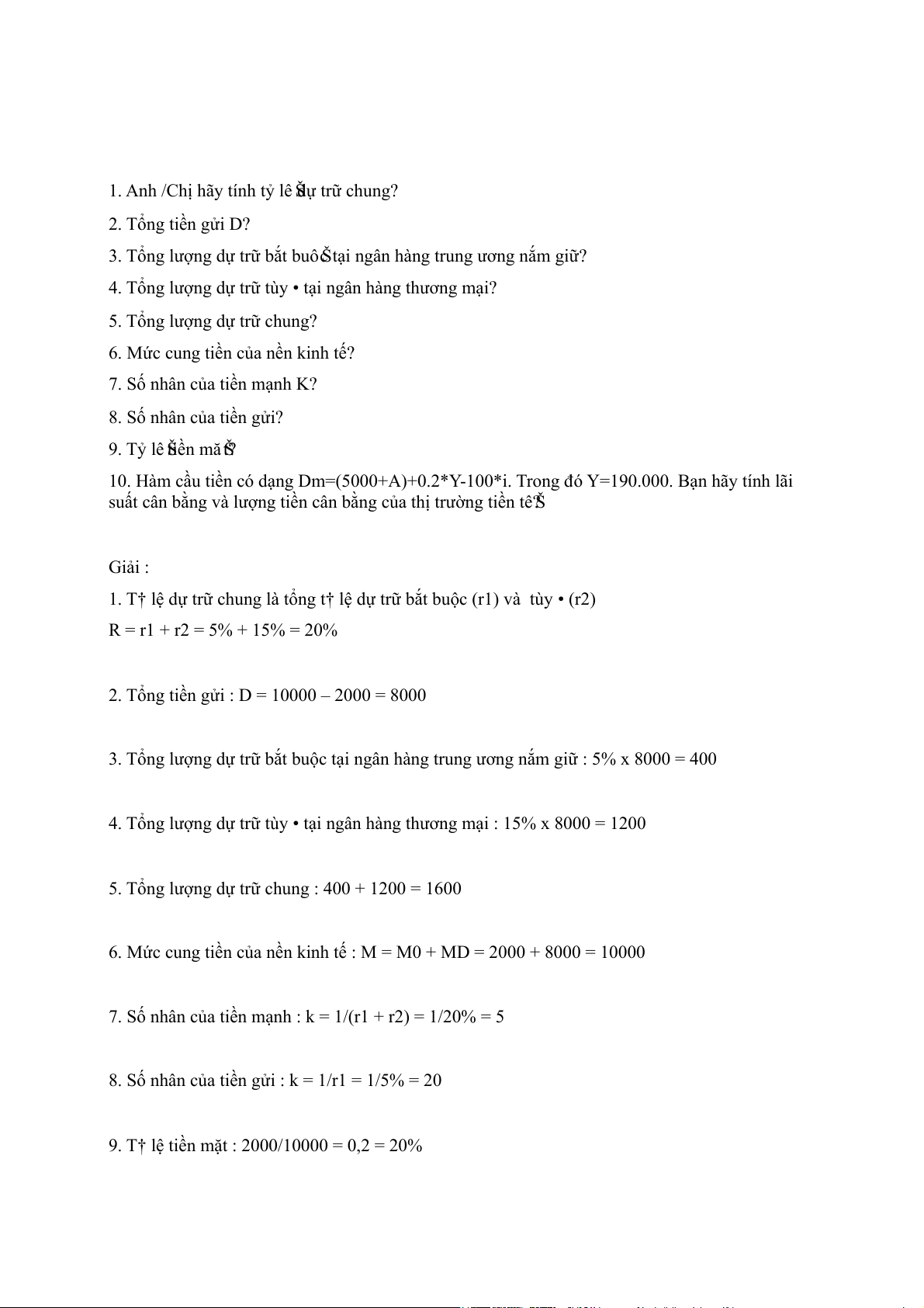 8. Số nhân của tiền gửi? 9. Tỷ lê Š tiền mă Š t?