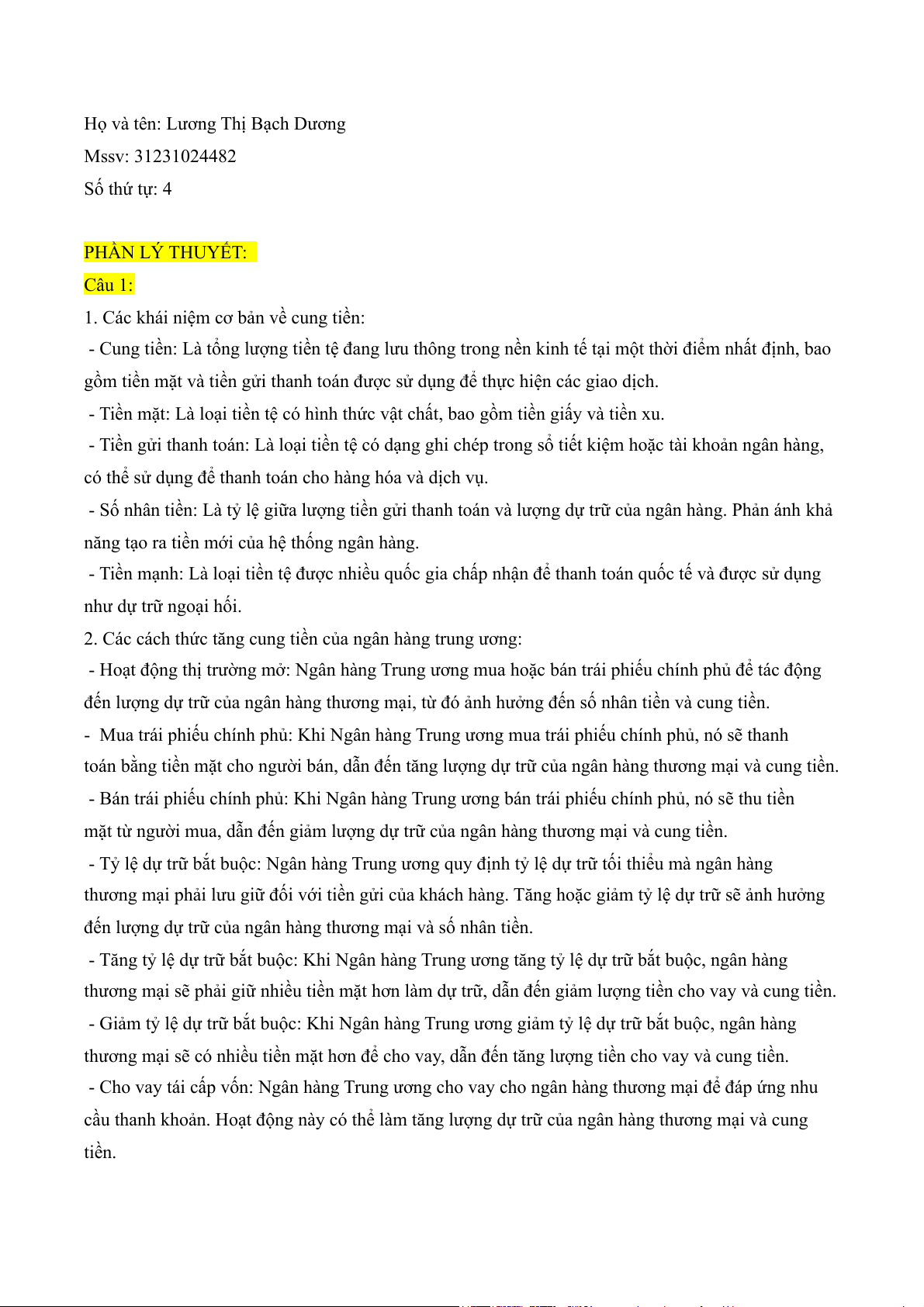 Họ và tên: Lương Thị Bạch Dương Mssv: 31231024482 Số thứ tự: 4 PHẦN LÝ THUYẾT: Câu 1:
