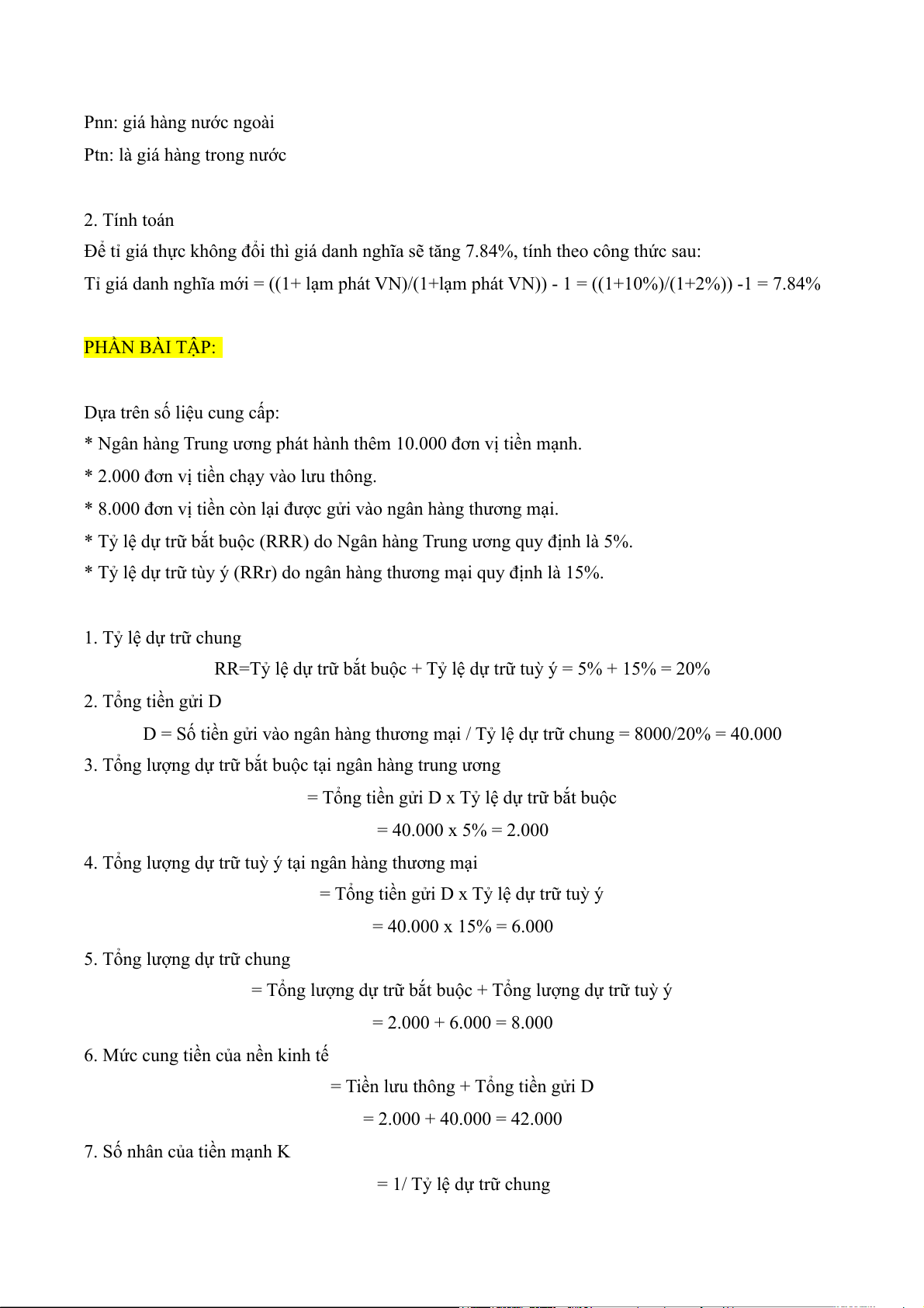 Tỉ giá danh nghĩa mới = ((1+ lạm phát VN)/(1+lạm phát VN)) - 1 = ((1+10%)/(1+2%)) -1 = 7.84% PHẦN BÀI TẬP: