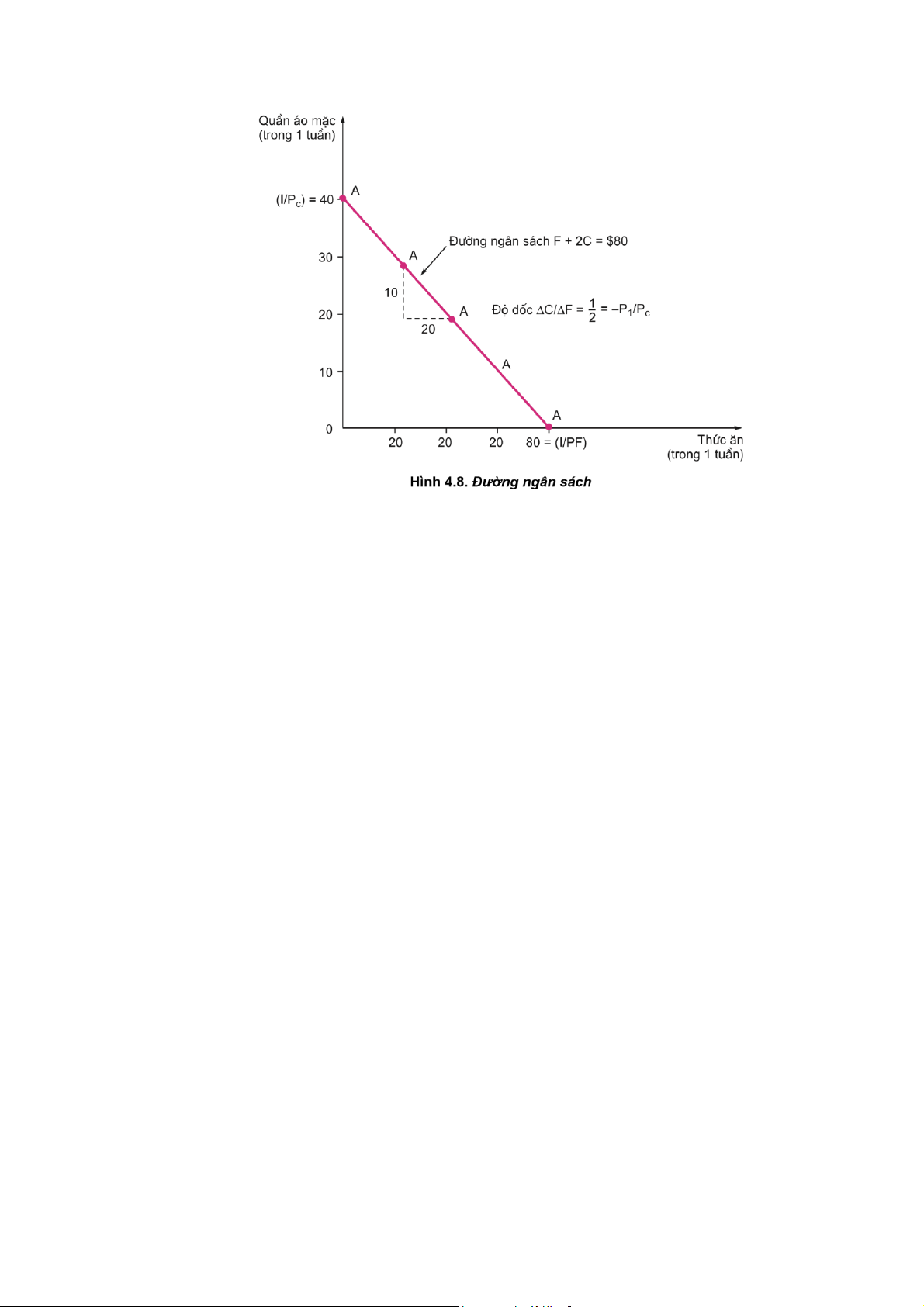 AG có giá thực phẩm PF = $1/đơn vị, và giá quần áo là PC = $2/đơn vị. Độ dốc của đường này là -PF/PC.