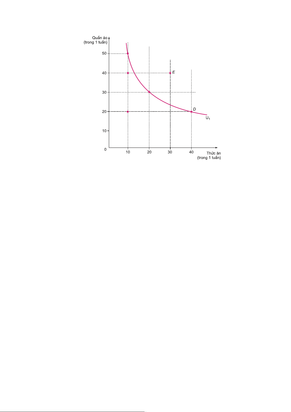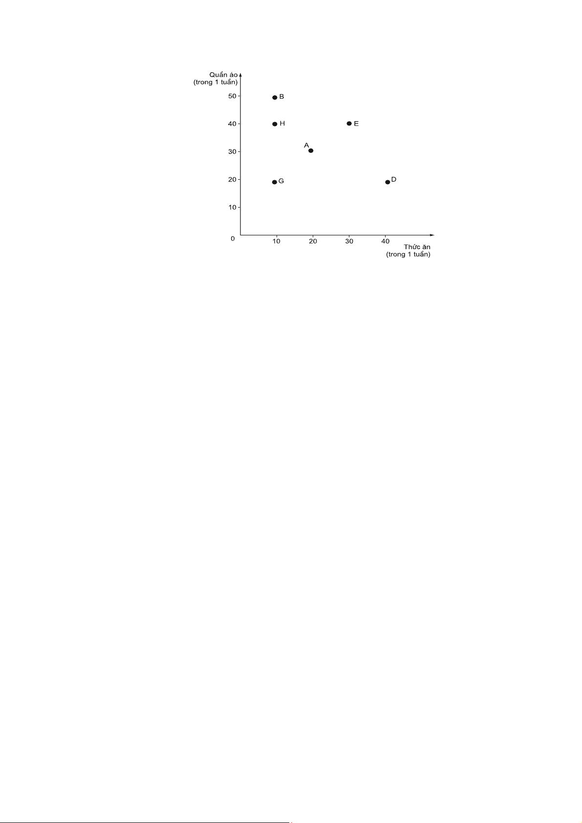 Bảng 4.1: Các giỏ hàng hóa lựa chọn Giỏ hàng hóa Thức ăn (kg) Quần áo (bộ) A 20 30 B 10 50 D 40 20 E 30 40 G 10 20 H 10 40