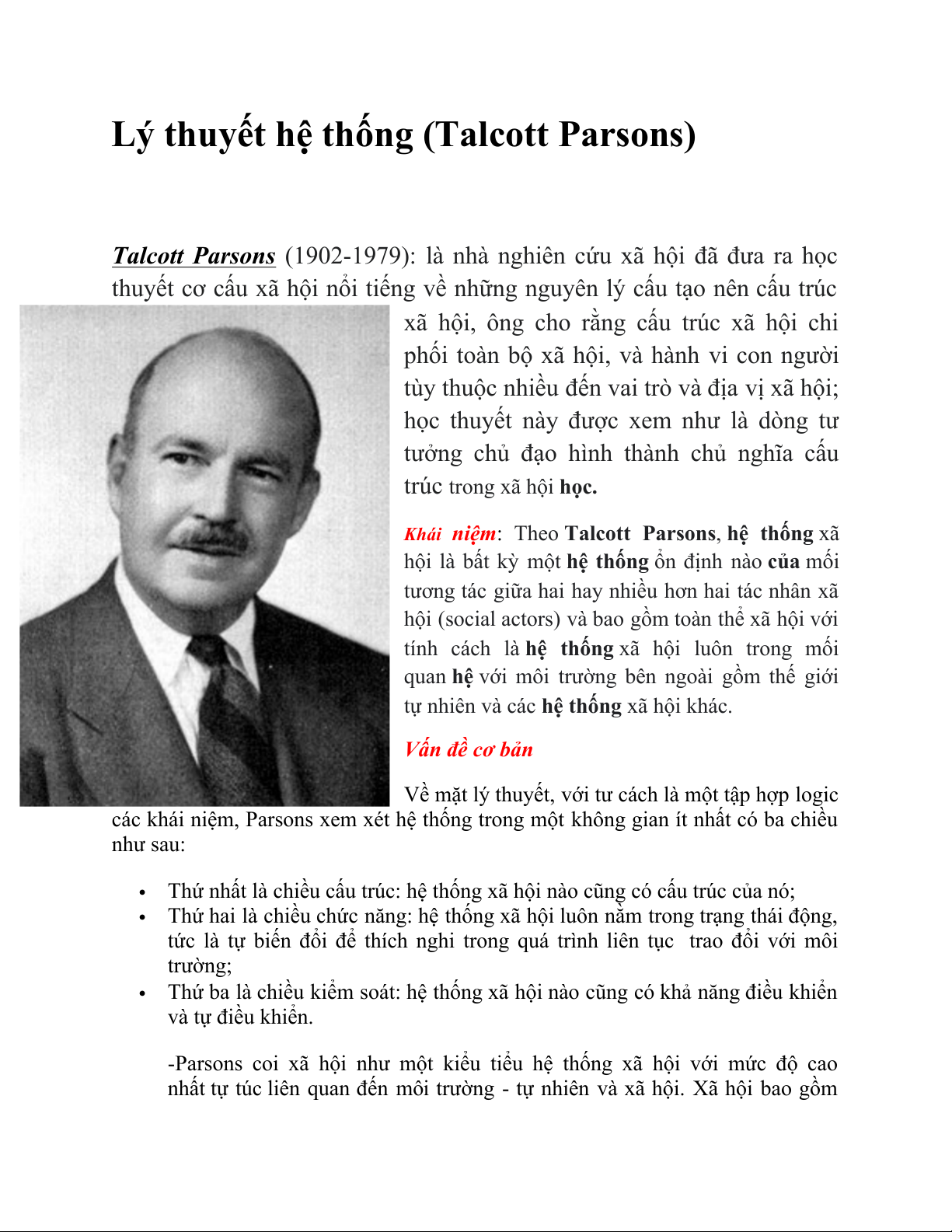 Talcott Parsons (1902-1979): là nhà nghiên cứu xã hội đã đưa ra học