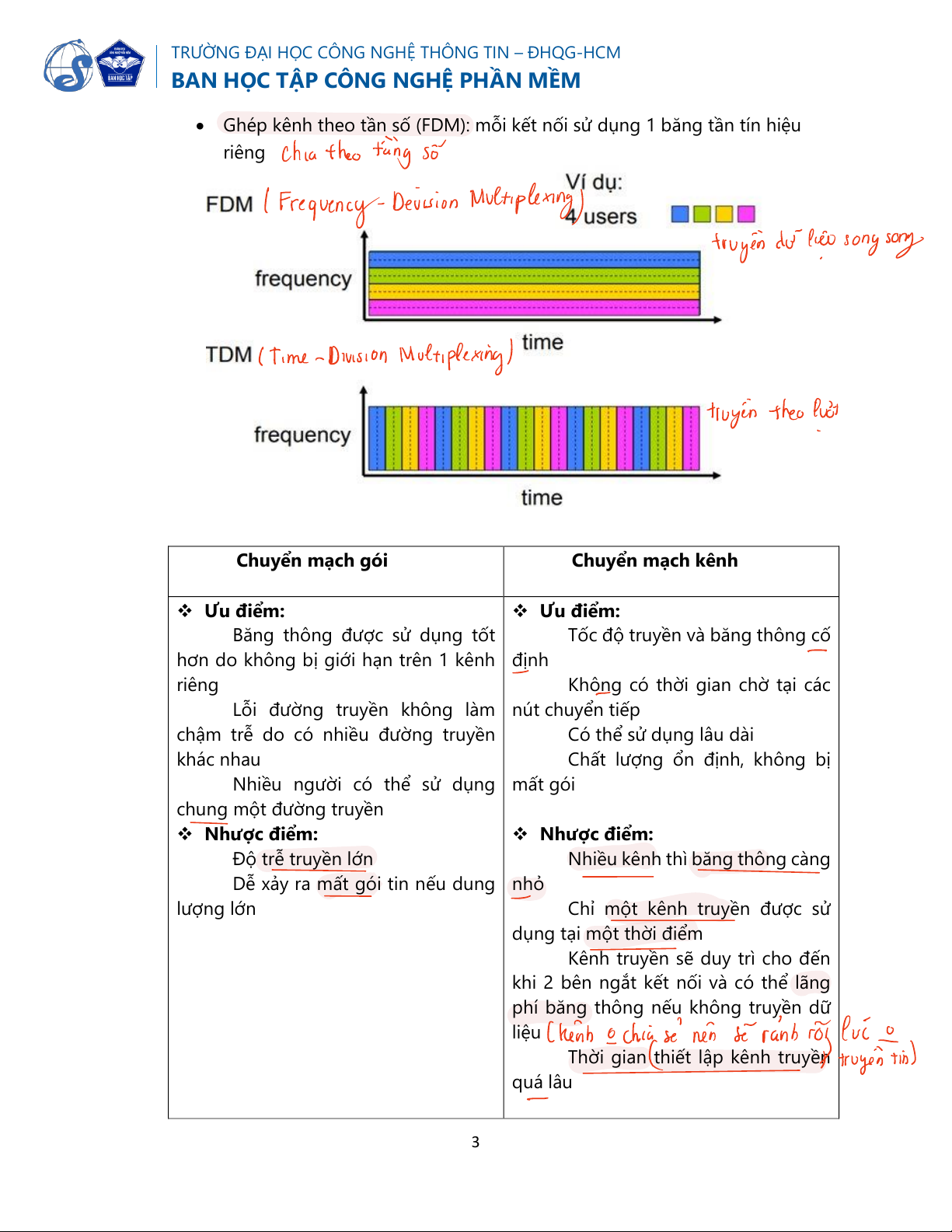 • Ghép kênh theo tần số (FDM): mỗi kết nối sử dụng 1 băng tần tín hiệu riêng Chuyển mạch gói Chuyển mạch kênh ❖ Ưu điểm: ❖ Ưu điểm: