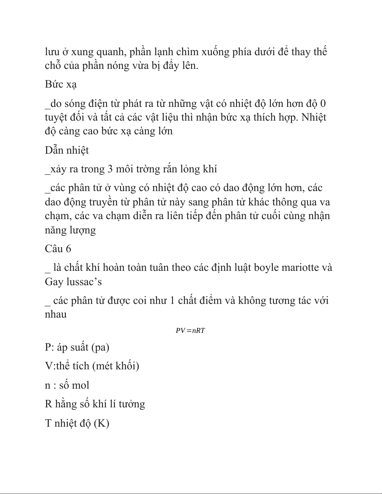 _ các phân tử được coi như 1 chất điểm và không tương tác với nhau PV =nRT P: áp suất (pa) V:thể tích (mét khối) n : số mol