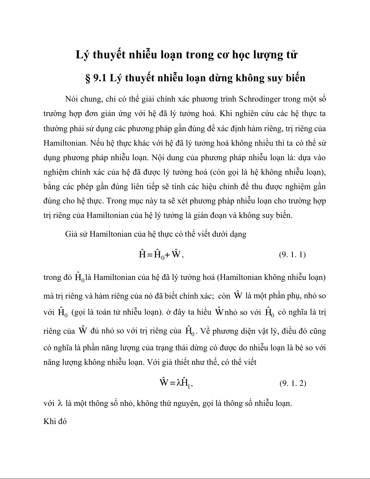 năng lượng không nhiễu loạn. Với giả thiết như thế, có thể viết ˆ ˆ W=λ 1 H , (9. 1. 2)