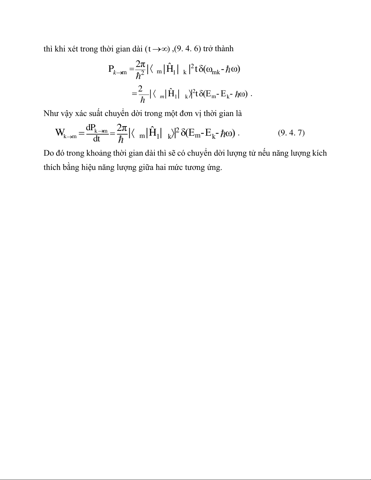 Như vậy xác suất chuyển dời trong một đơn vị thời gian là d k P m 2π ˆ 2 W . (9. 4. 7) | |H | | k m 1 k δ(Em-Ek dt -