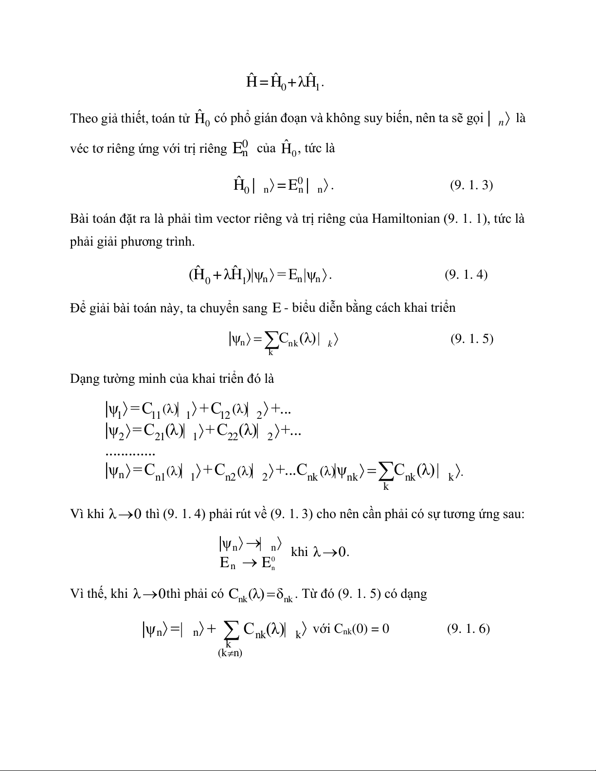 C k(λ)δnk. Từ đó (9. 1. 5) có dạng |ψn | n Cnk(λ)| k với C ( nk 0) = 0 (9. 1. 6) k (k n )