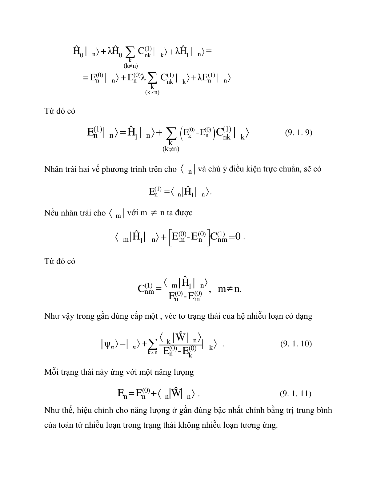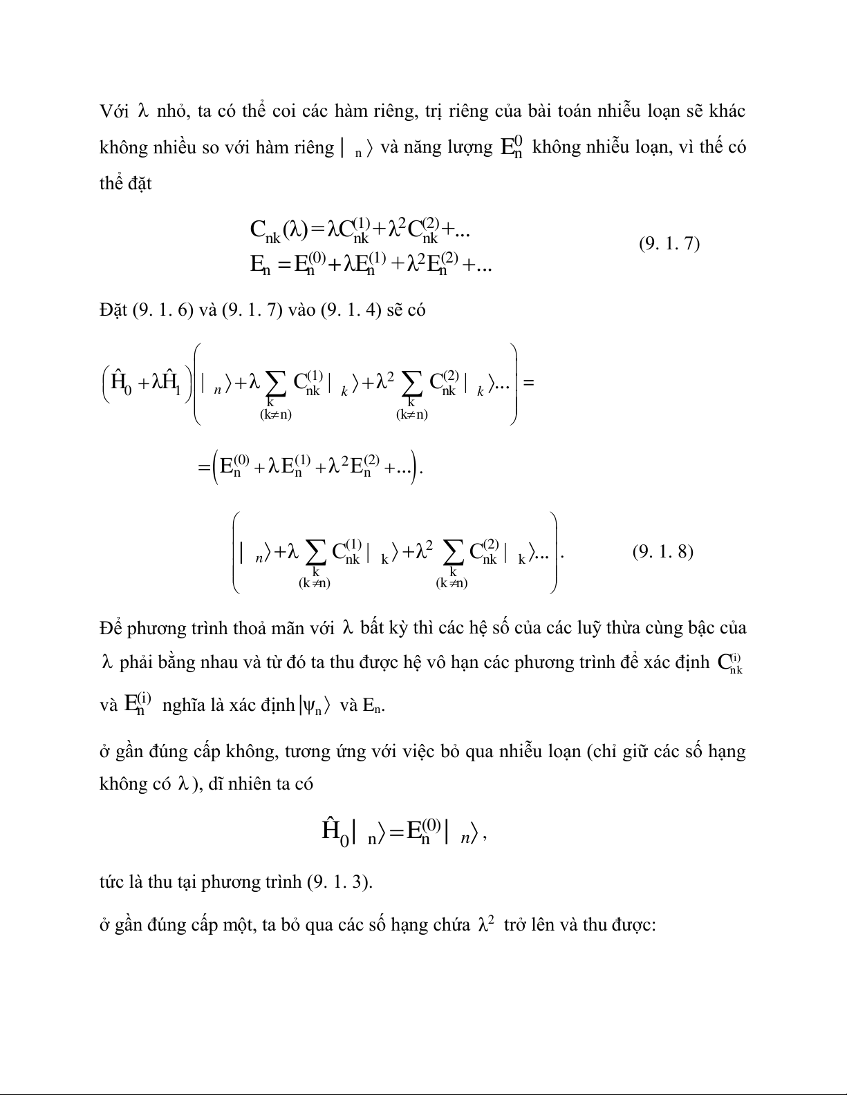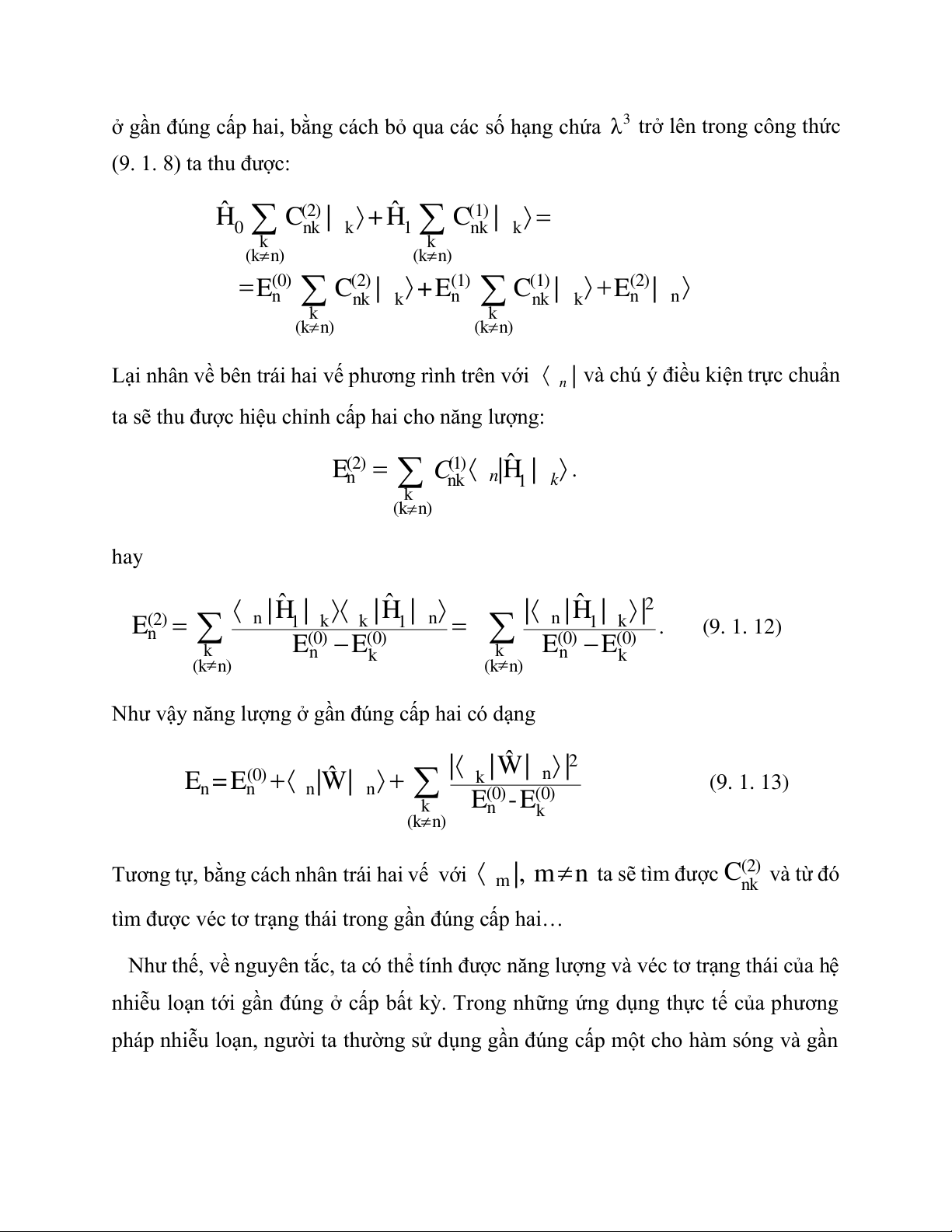 λ trở lên trong công thức (9. 1. 8) ta thu được: ˆ (2) ˆ (1) 0 H n C k |k+ 1 H n C k |k k k (kn) (kn) (0) (2) (1) (1) (2) n E C nk |k + n E Cnk |k n E | n k k (kn) (kn)