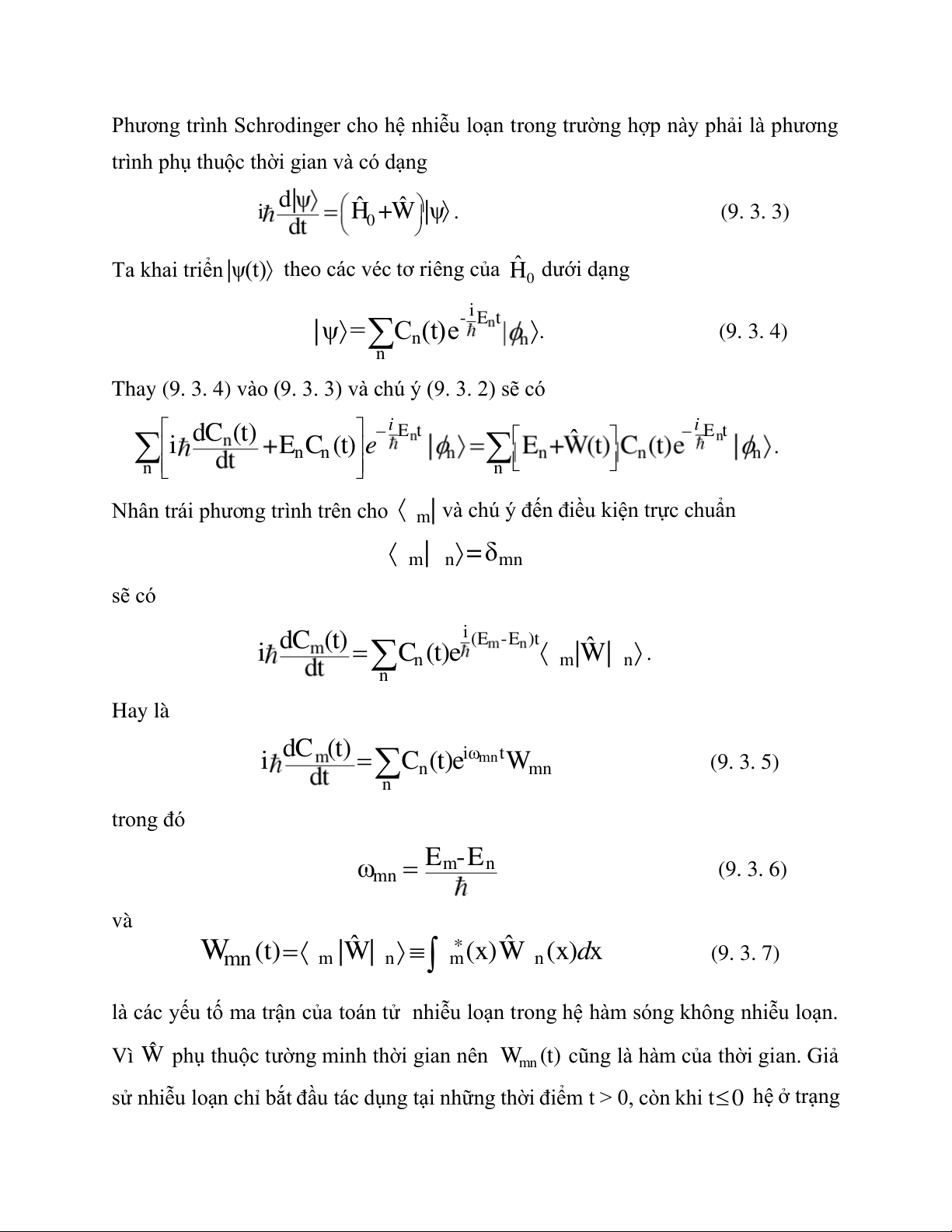 | và chú ý đến điều kiện trực chuẩn m | n =δmn sẽ có i dC (t) (E -E )t ˆ i n C (t)e m|W| n . n Hay là dC (t) i m ω nt i n C (t)e m W n (9. 3. 5) n trong đó Em-En mn ω (9. 3. 6) và * m W n ˆ ˆ (t) m |W| n m(x)W n(x) x d (9. 3. 7)