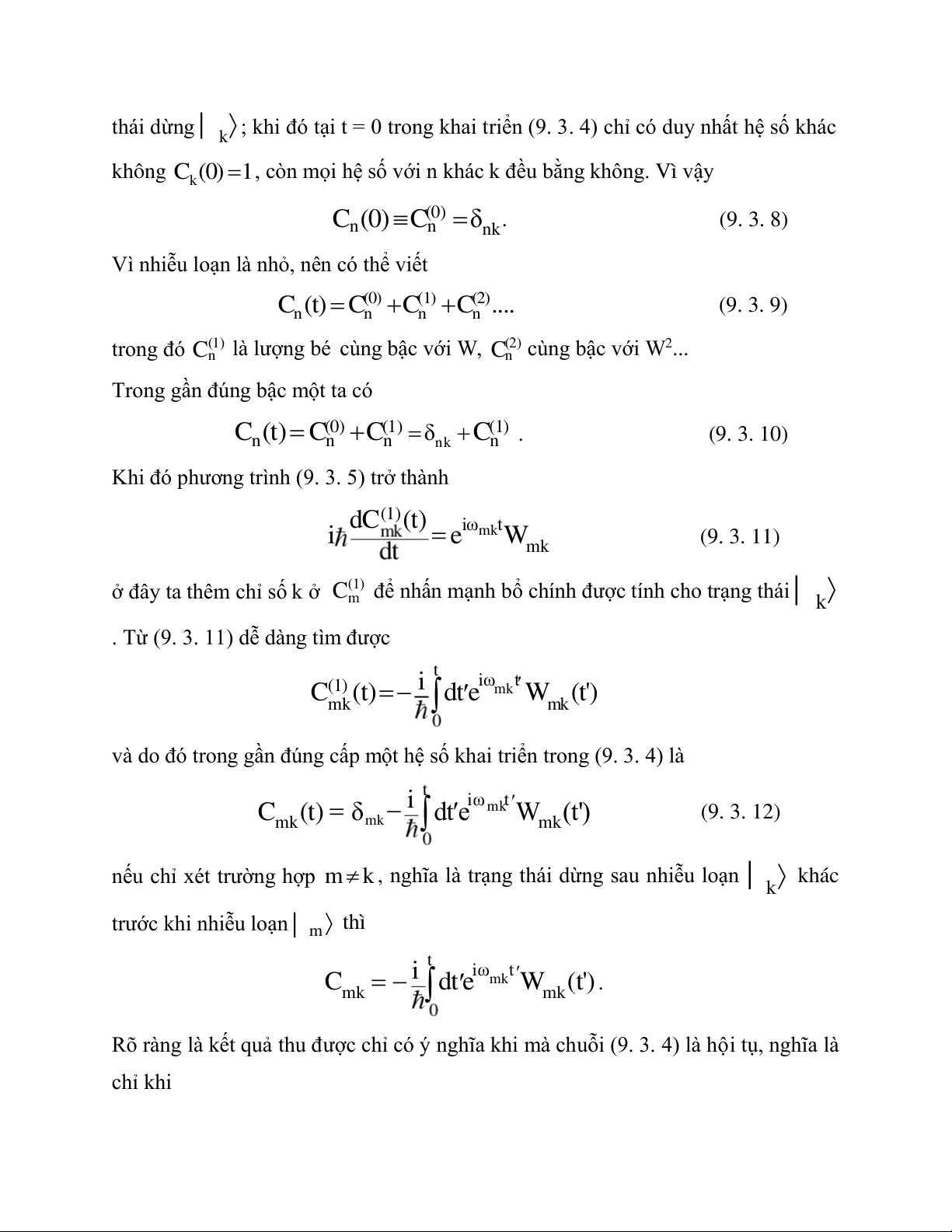 và do đó trong gần đúng cấp một hệ số khai triển trong (9. 3. 4) là t i iωmkt m C k(t) δmk dt e m W k(t') (9. 3. 12)