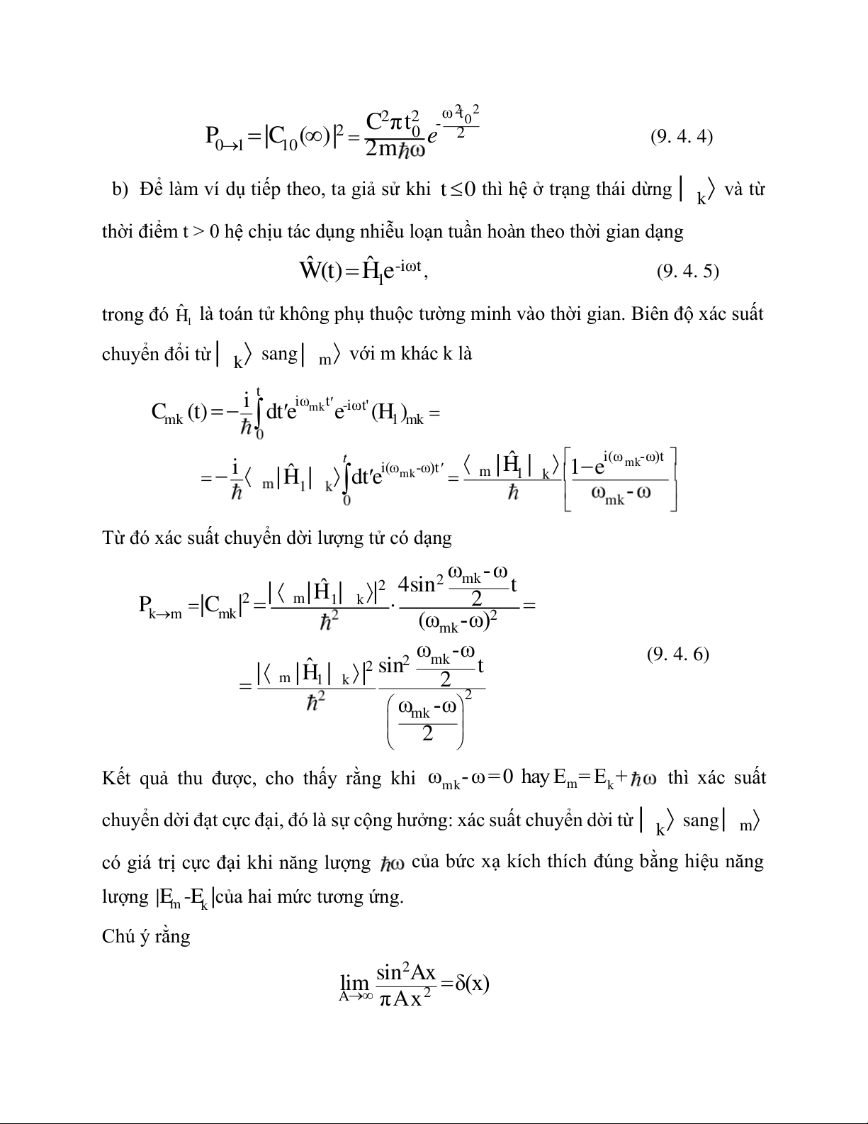 Từ đó xác suất chuyển dời lượng tử có dạng 2 m ω k-ω ˆ 2 4sin t 2 | m| H1|k | P |C | 2 k m mk 2 ( m ω k-ω) 2 m ω k-ω (9. 4. 6) ˆ 2 sin t | m | 1 H | k| 2 2 m ω k -ω 2