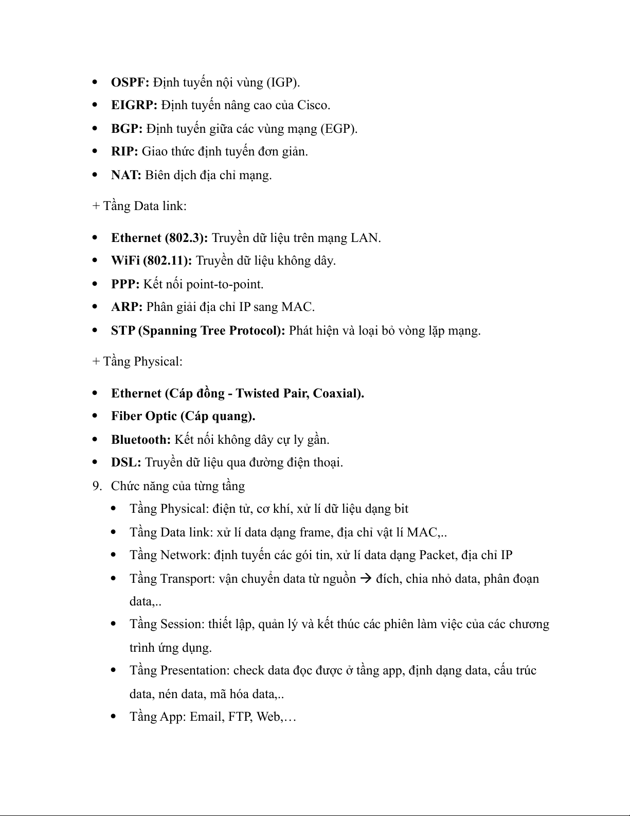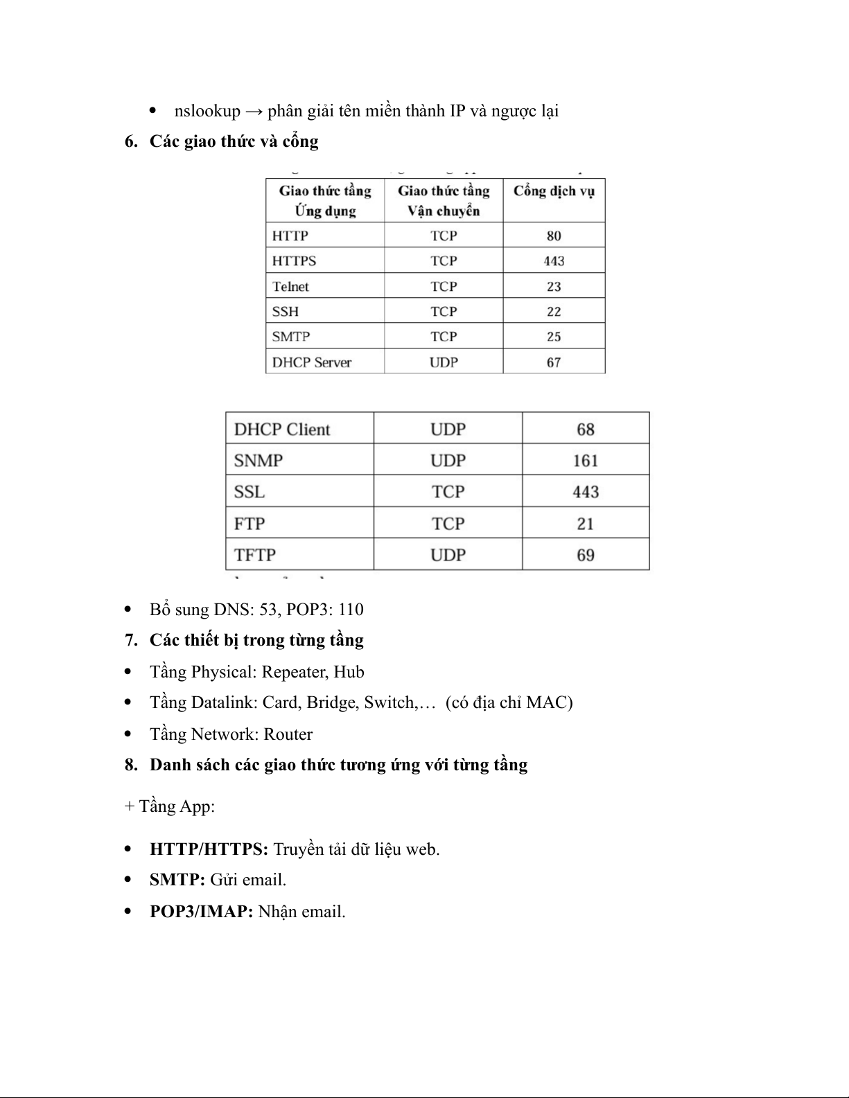 8. Danh sách các giao thức tương ứng với từng tầng + Tầng App: