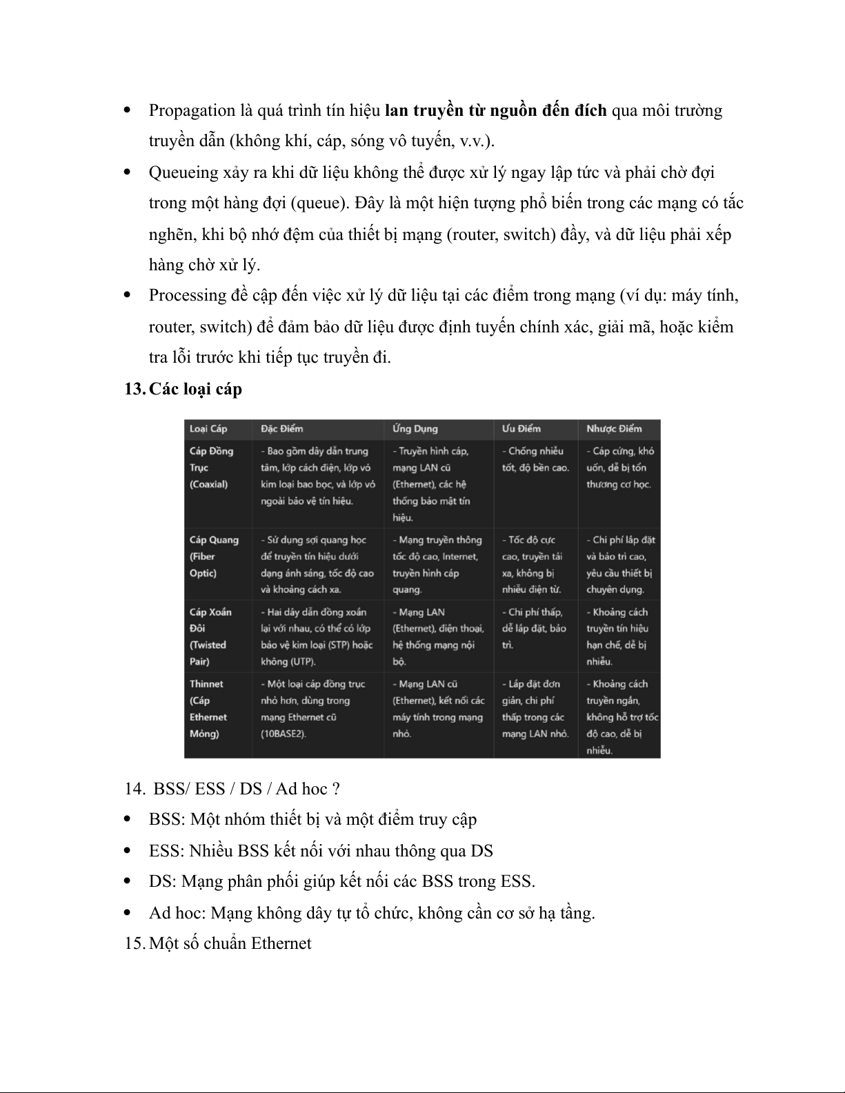 tra lỗi trước khi tiếp tục truyền đi. 13. Các loại cáp 14. BSS/ ESS / DS / Ad hoc ?