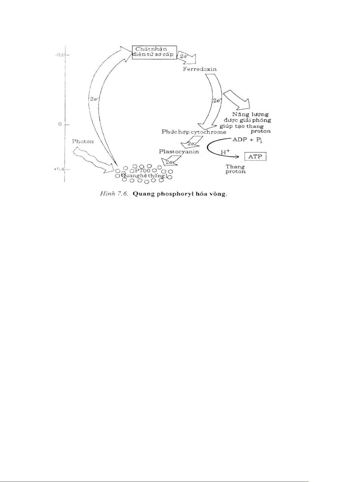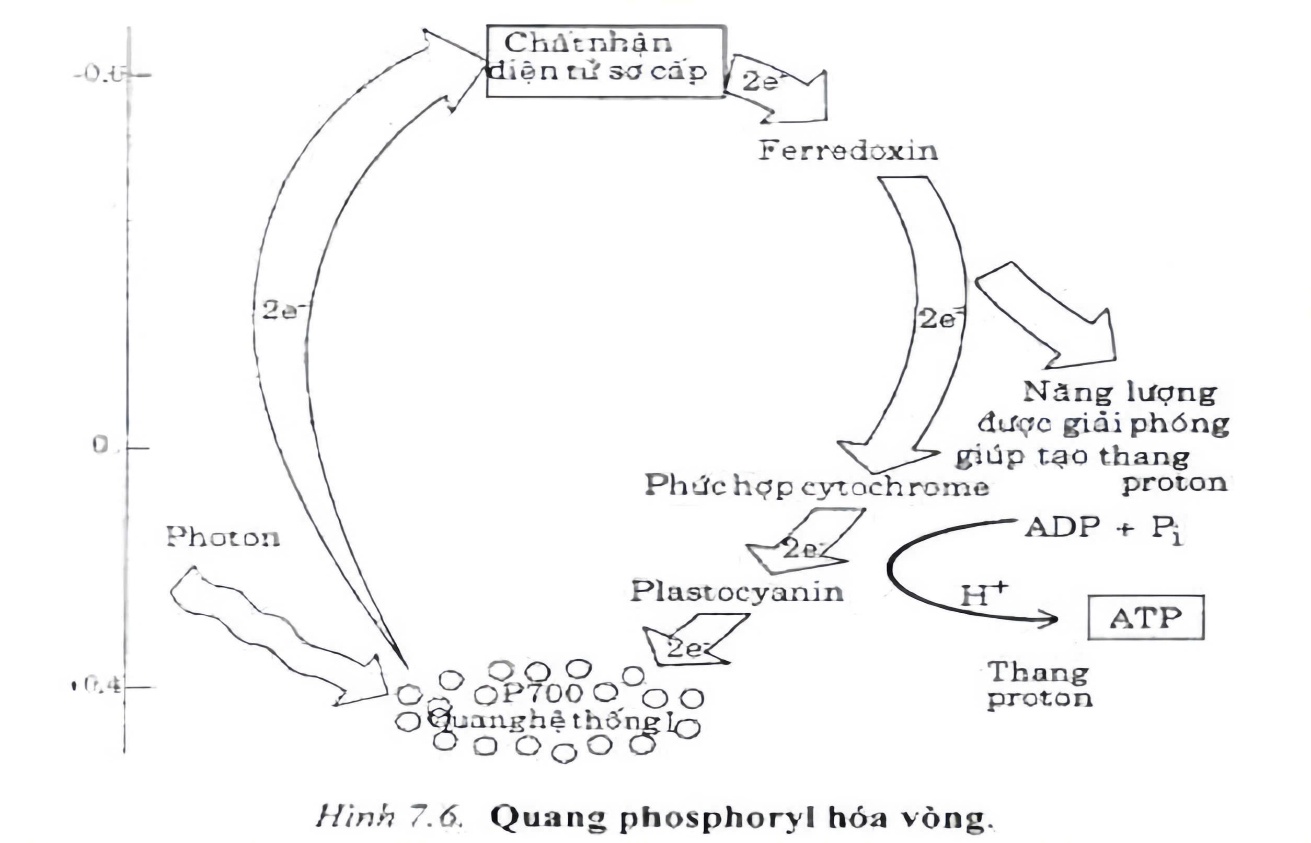 Sự chuyển điện tử: Trong phản ứng quang hợp, chlorophyll nhận photon ánh sáng, giải phóng electron rồi truyền qua các chất nhận điện tử trên màng thylakoid. Electron đi qua chuỗi phản ứng và quay lại chính chlorophyll. Trong quang phosphoryl hóa vòng, trung tâm phản ứng là P700 (thuộc hệ sắc tố PSI), hấp thụ ánh sáng bước sóng ~700nm. Protein Fd (ferredoxin) đóng vai trò nhận điện tử.