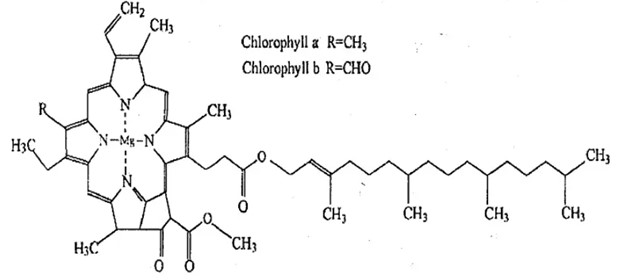 + Chlorophyll b: có nhóm -CHO thay cho -CH₃ ở vòng bên.