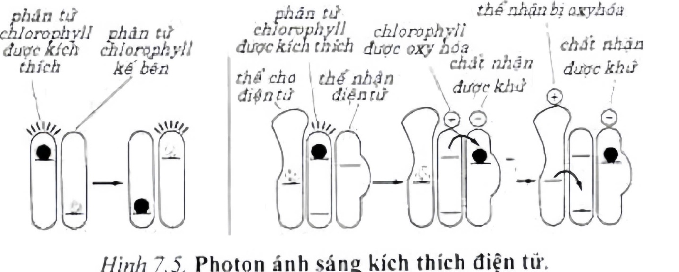 Năng lượng ánh sáng tồn tại dưới dạng photon. Photon đập vào chlorophyll (hoặc carotenoid) sẽ được hấp thụ, giúp chuyển điện tử của phân tử sắc tố từ mức năng lượng thấp lên trạng thái kích thích ở mức năng lượng cao.