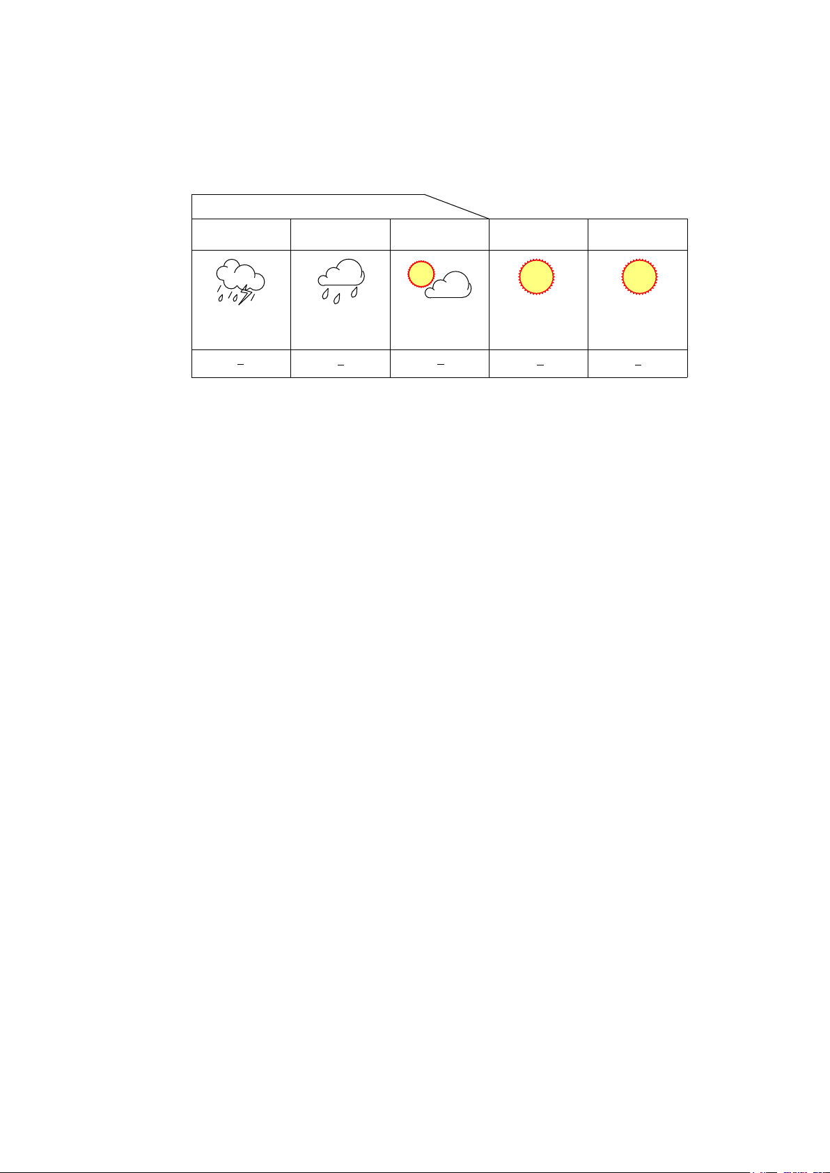 Dự báo thời tiết trong 5 ngày Thứ 2 Thứ 3 Thứ 4 Thứ 5 Thứ 6 Có mưa rào Nhiều mây, có Có mây, Có mây, Trời nắng, và giông mưa rải rác không mưa không mưa ít mây 220C 290C 220C 320C 260C 340C 230C 350C 250C 370C Bảng 1