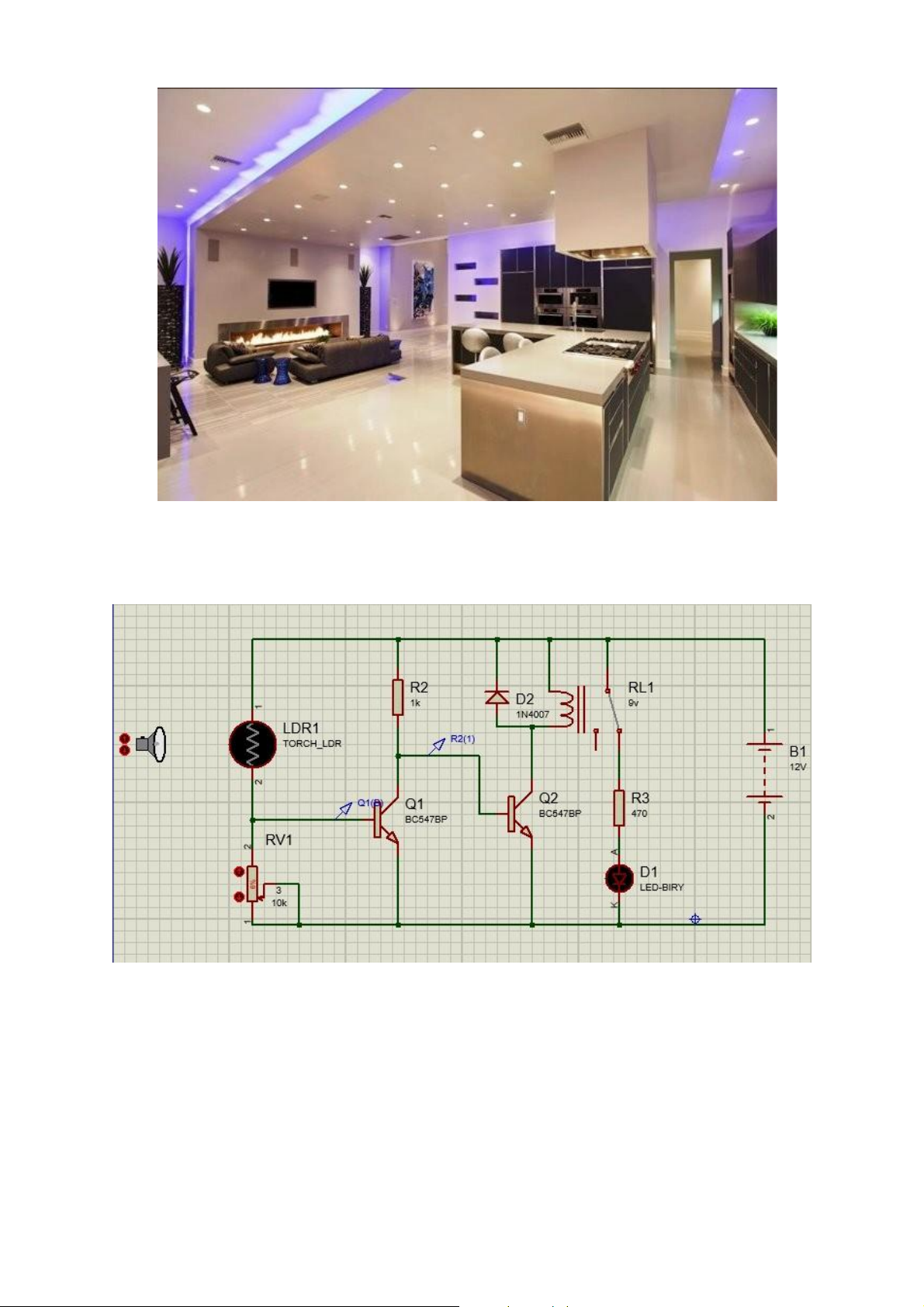 đến Q1 không hoạt động => dòng điện sẽ chạy từ R2 qua Q2 => kích relay => relay hít nên đèn led tắt. •