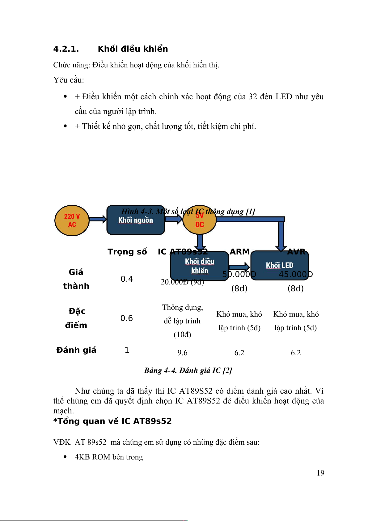 Hình 4-3. Một số loại IC thông dụng [1] Trọng số IC AT89s52 ARM AVR Giá 0.4 50.000Đ 45.000Đ thành 20.000Đ (9đ) (8đ) (8đ) Đặc Thông dụng, 0.6 Khó mua, khó Khó mua, khó điểm dễ lập trình lập trình (5đ) lập trình (5đ) (10đ) Đánh giá 1 9.6 6.2 6.2