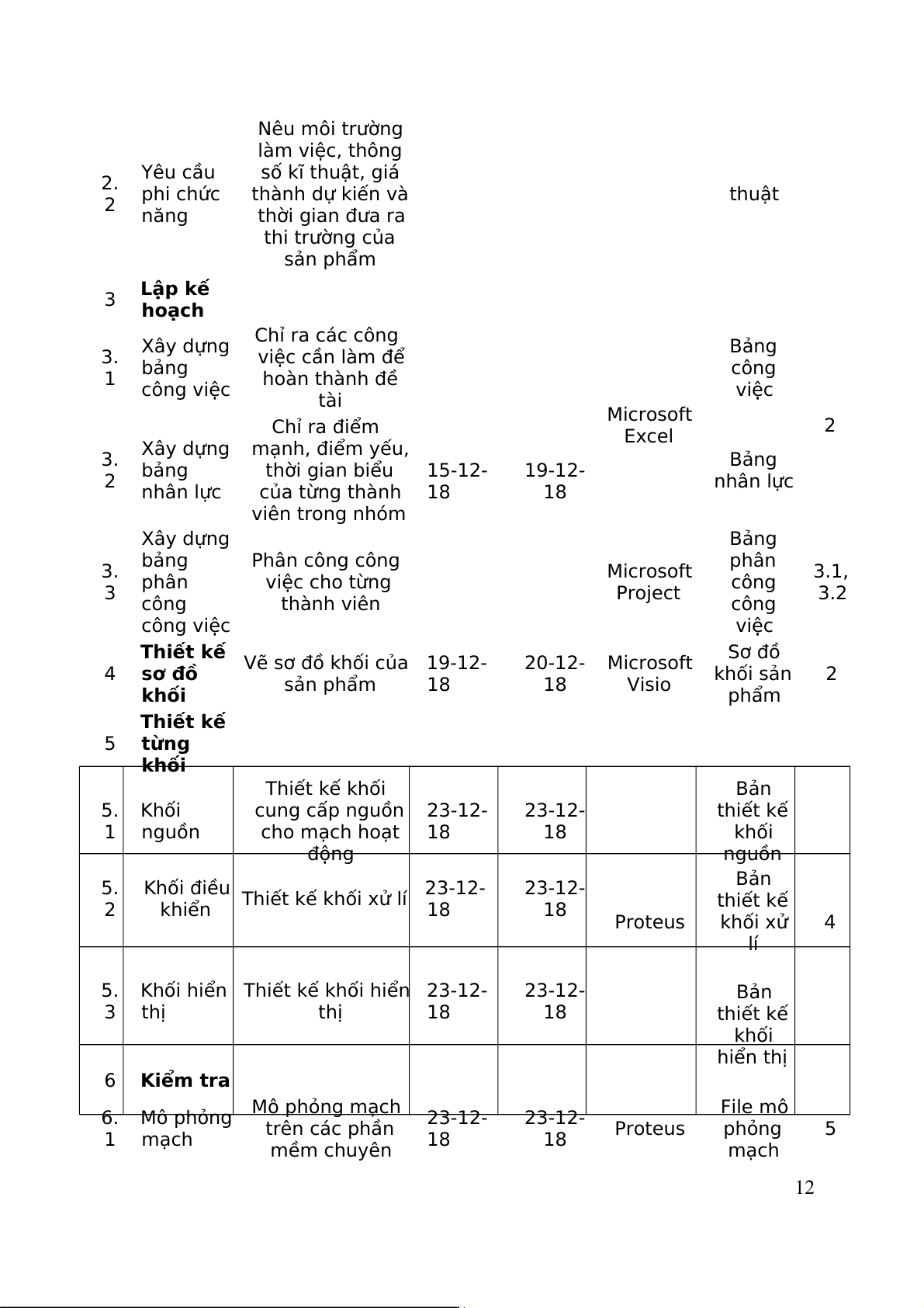 Nêu chức năng, 13-12- 15-12- Microsoft Bản mô 1 chức hoạt động của tả yêu 1 năng sản phẩm 18 18 Word cầu kỹ 11 Nêu môi trường làm việc, thông 2. Yêu cầu số kĩ thuật, giá phi chức thành dự kiến và thuật 2 năng thời gian đưa ra thi trường của sản phẩm 3 Lập kế hoạch Chỉ ra các công 3. Xây dựng việc cần làm để Bảng 1 bảng công công việc hoàn thành đề tài việc Microsoft Chỉ ra điểm Excel 2